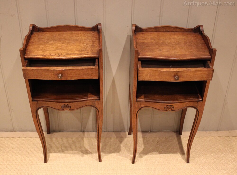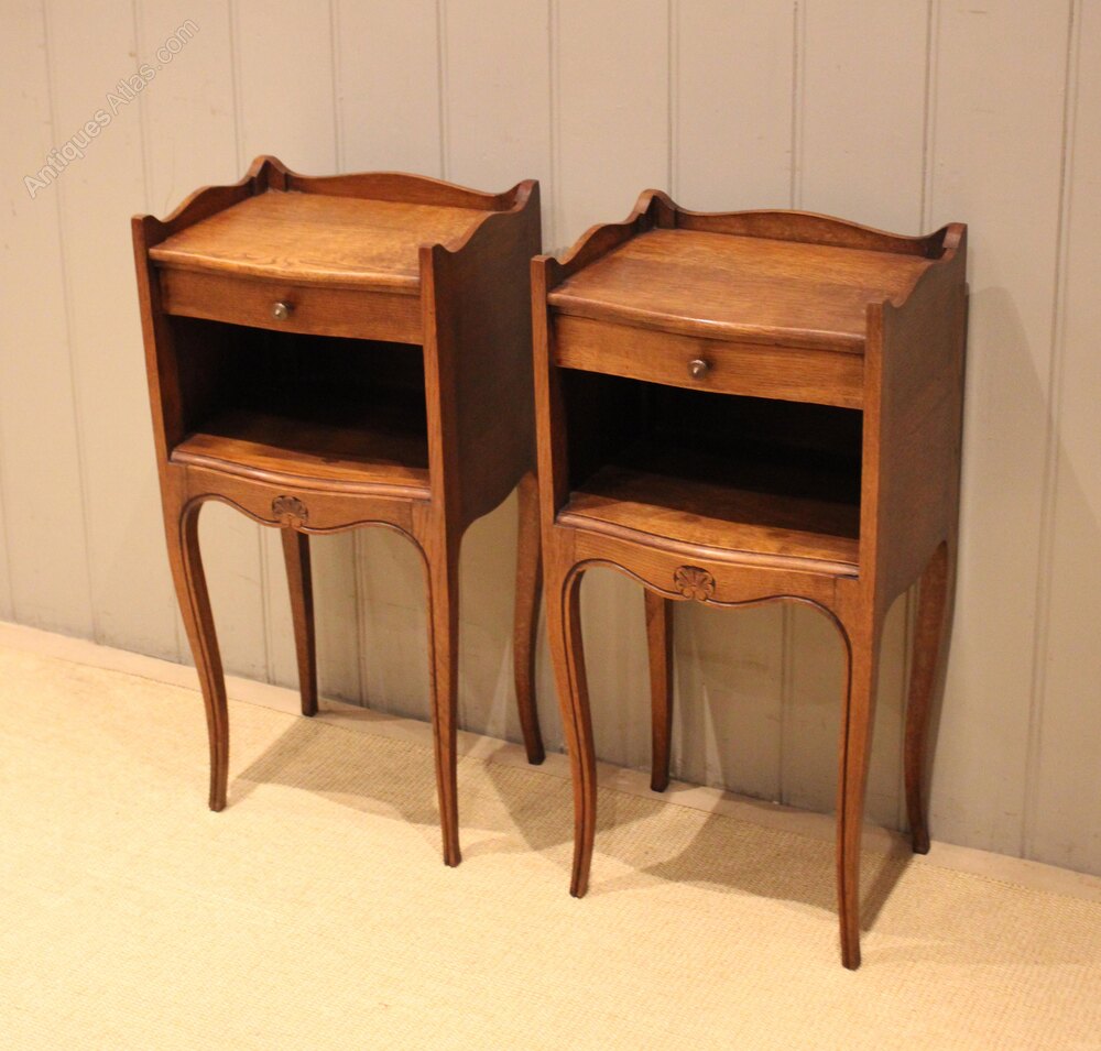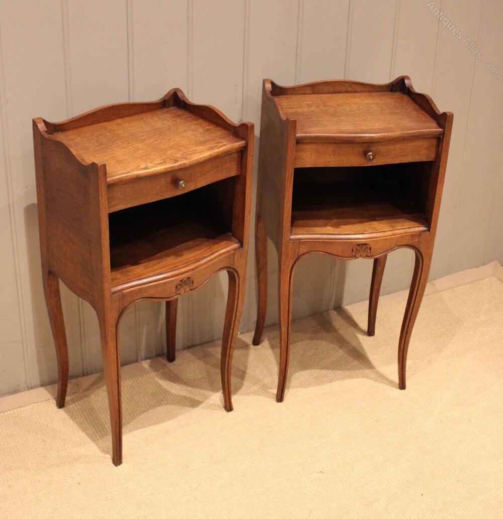 Pair of French oak bedside cabinets having shaped tops , with a single drawer above an open cupboard base , having a carved apron , raised on cabriole legs .