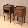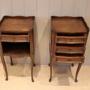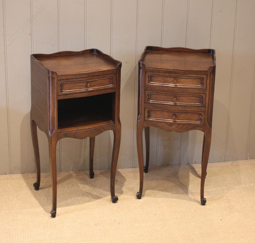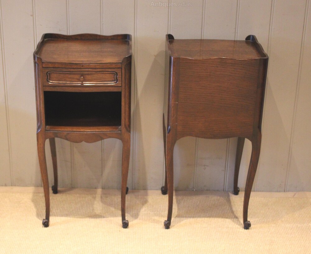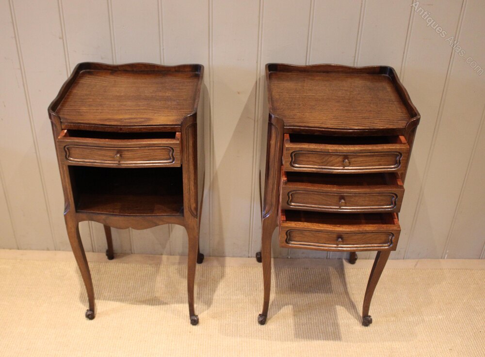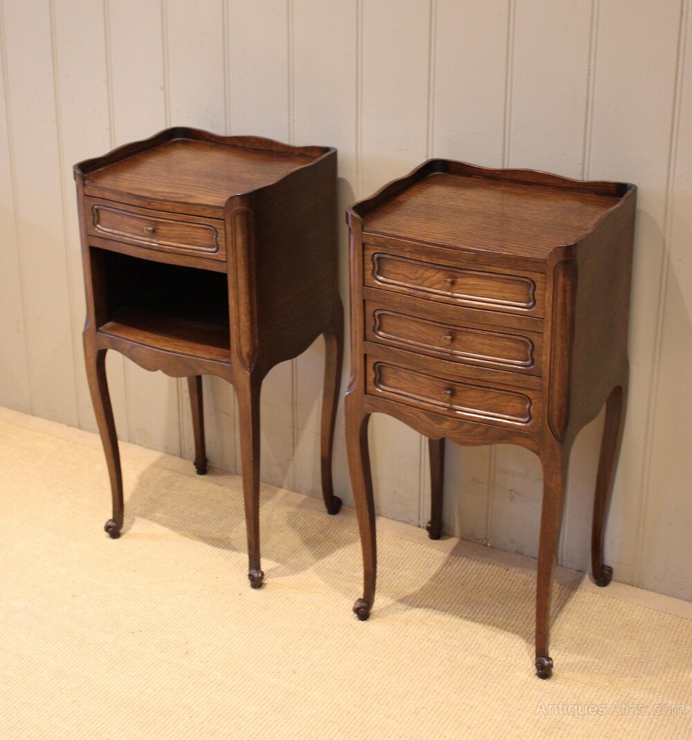 Pair of French oak bedside cabinets one having three drawers the other with a single drawer above an open cupboard base , raised on cabriole legs . Please note we have another very similar pair for sale , but the handles differ .