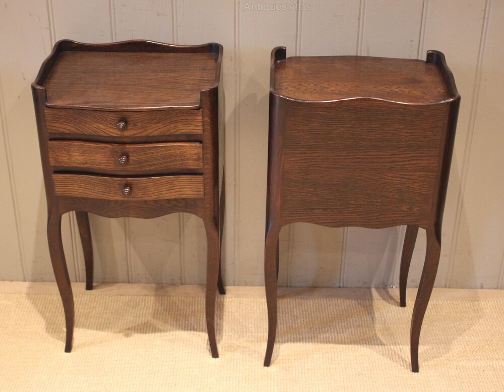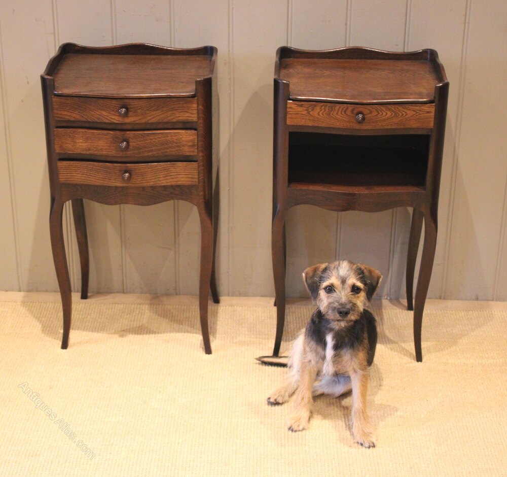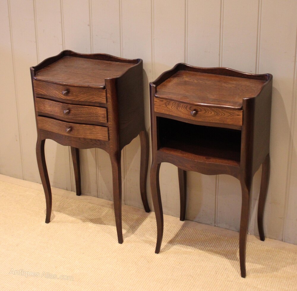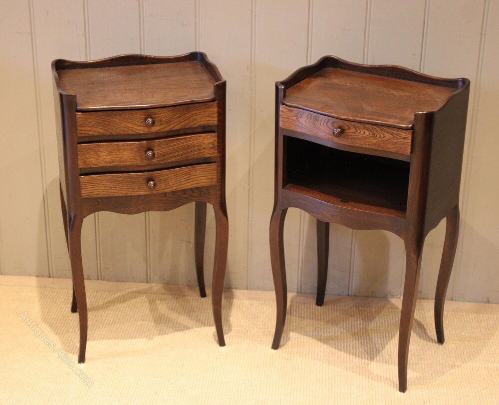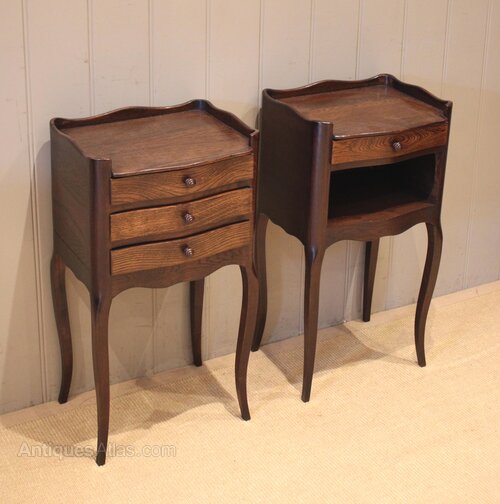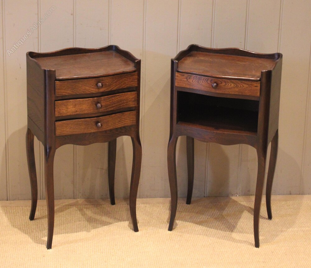 Pair of French oak bedside cabinets one having three drawers the other with a single drawer above an open cupboard base with a shaped apron raised on cabriole legs
