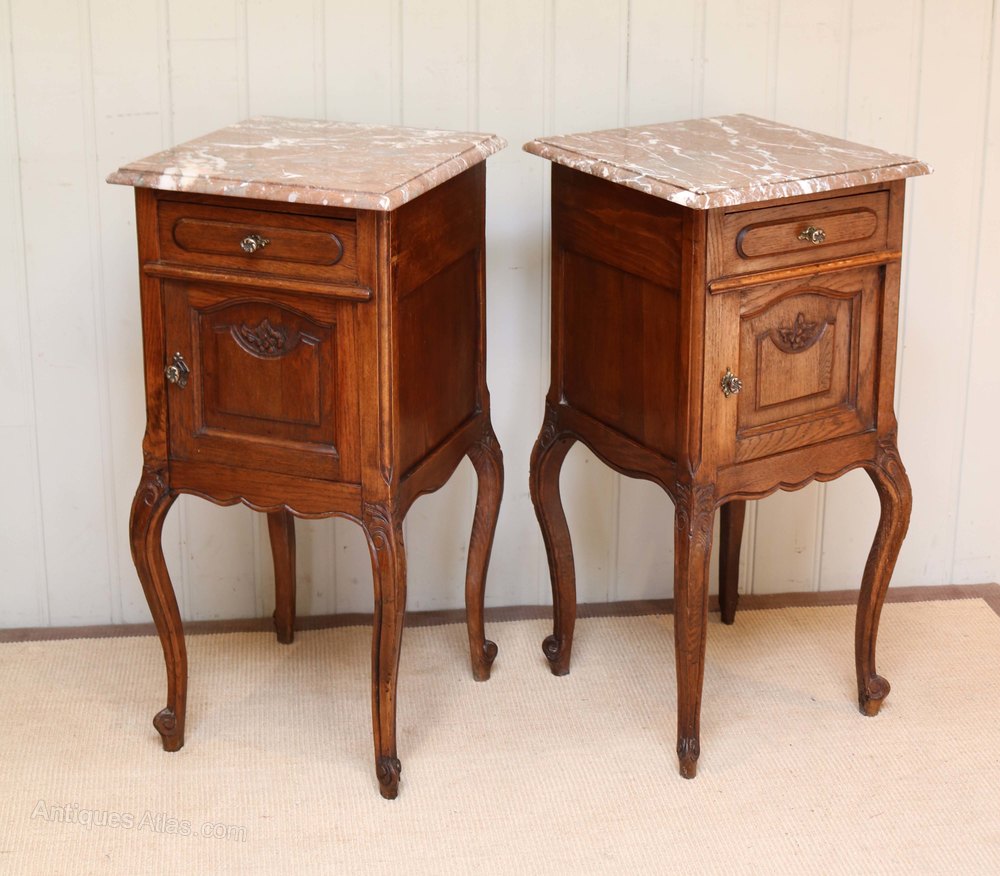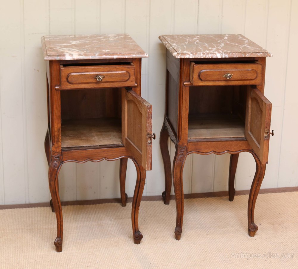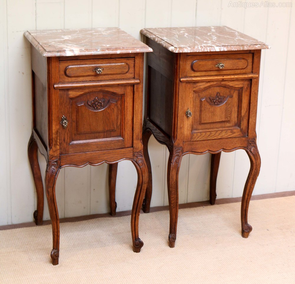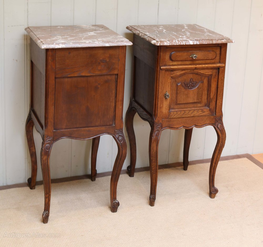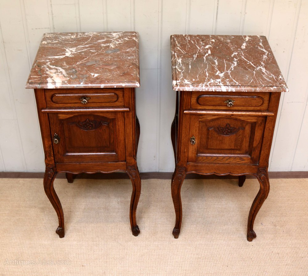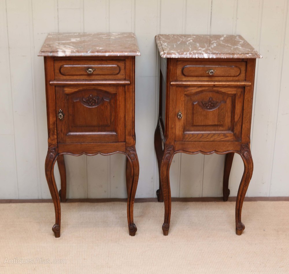 Pair Of French Oak Marble Top Bedside Cabinets