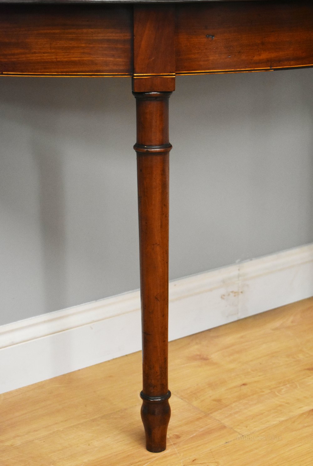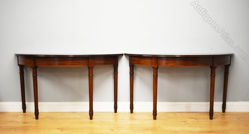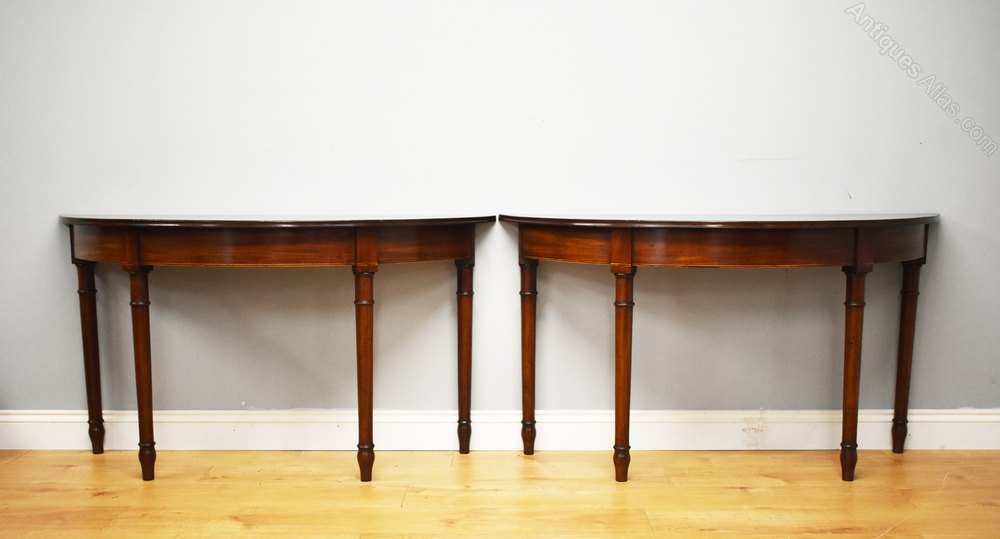 For sale is a good quality Pair of George III Mahogany Console Tables. Each table has a demi lune top, constructed using wonderfully figured mahogany. Both antique tables stand on elegant turned legs below a frieze inlaid with black and white line. Both tables are in very good condition, having been re-polished using traditional methods.