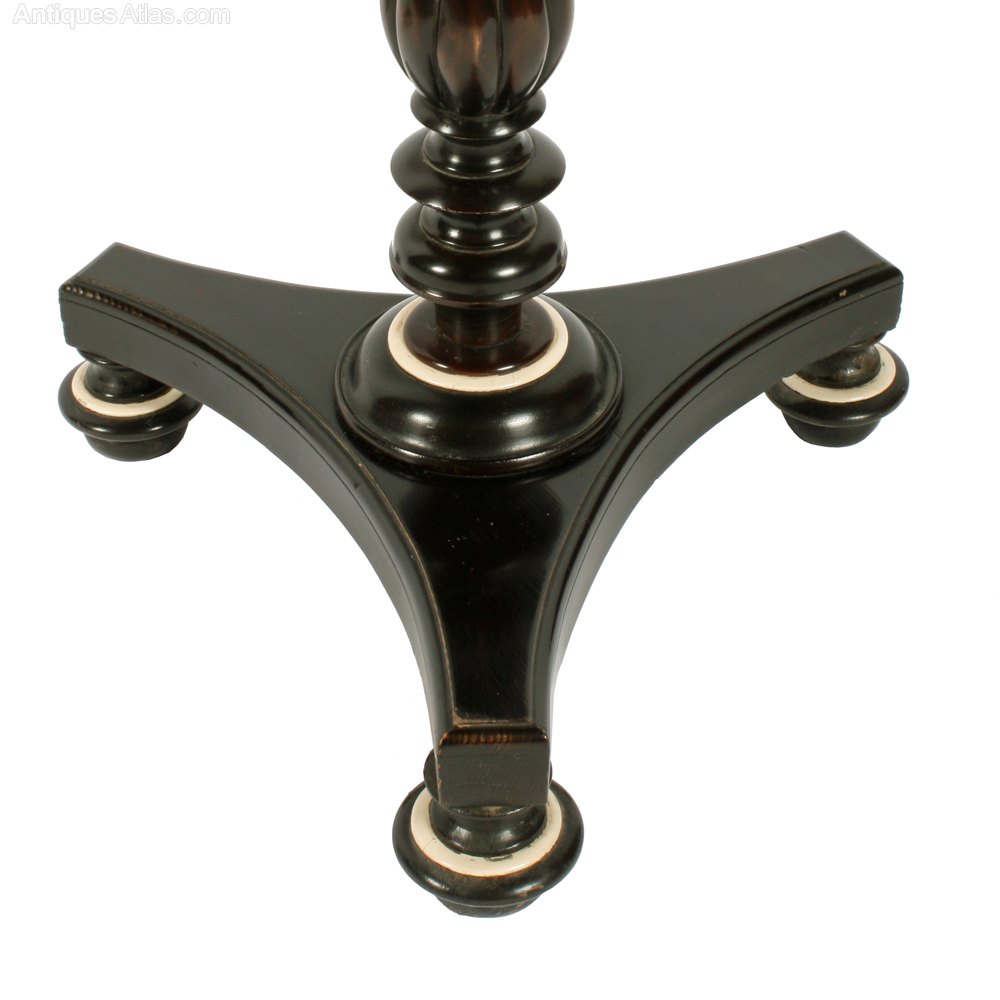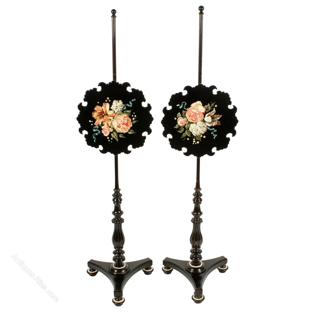 Circa 1820. An unusual stylish pair of George IV pole-screens. Uprights surmounted with a simple finial, the lacquered paper mâché screens in the form of flower petals, painted with flowers and ribbons, all resting on a classic elegant fluted ebonized stem with further ring turning, with bone on the bottom of the stem and the top of feet for contrast, sitting on a concave triangular platform base, with moulded edge resting on three bun feet.