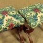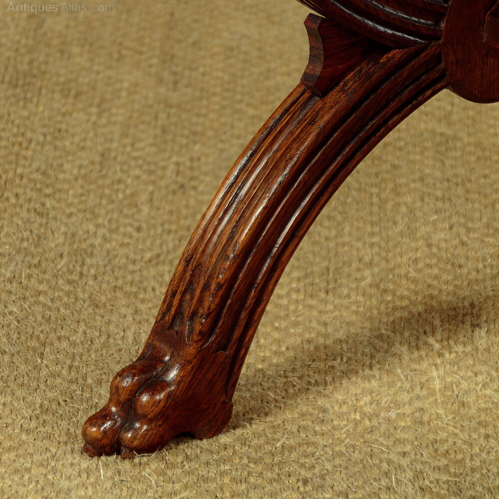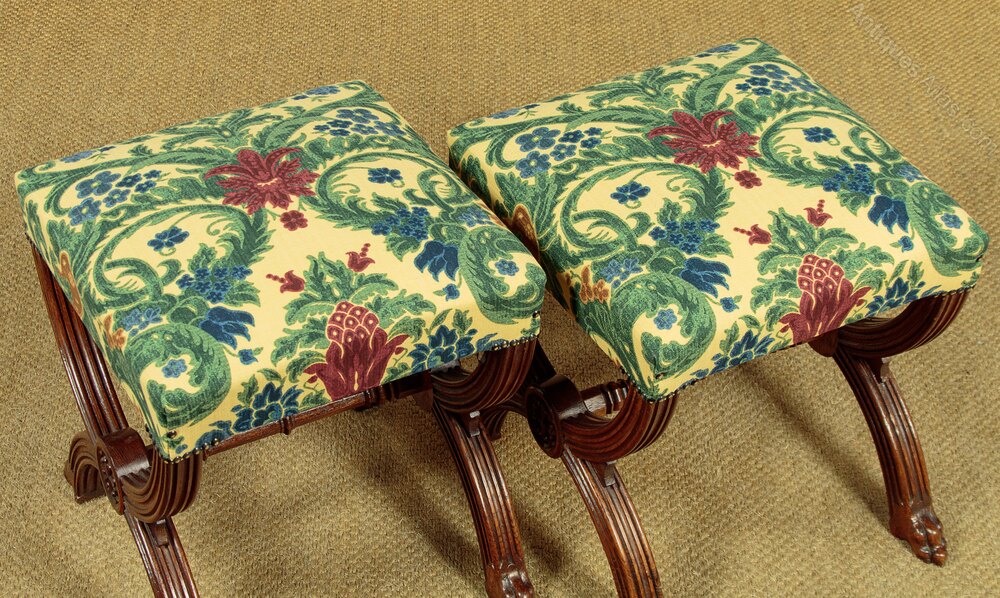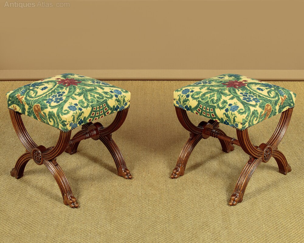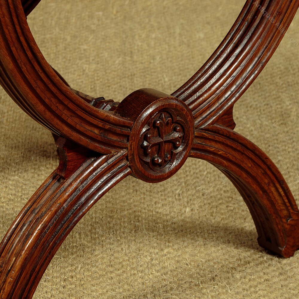 Splendid pair of Gothic revival oak stools c.1880. Sprung seats freshly upholstered in a striking damask patterned cloth. X frames in solid oak, moulded legs with claw feet joined with octagonal carved stretchers. Note the Gothic patonce crosses carved on the sides of the stools. Excellent condition, cleaned and waxed in our workshops.