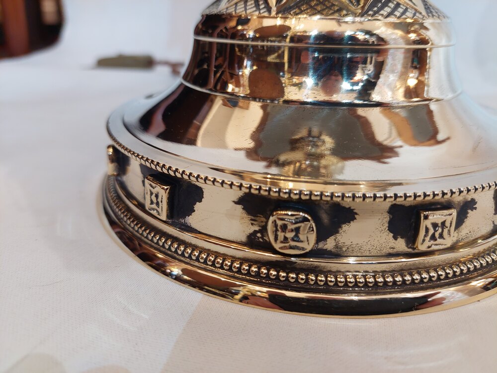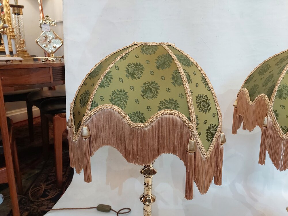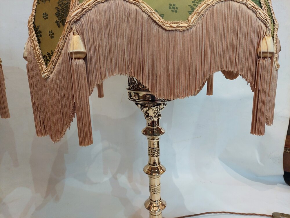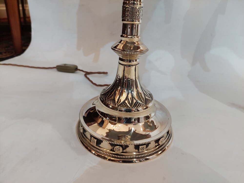 Pair of Heavy 19thC Gothic Revival Brass Altar Candlesticks converted to table lamps - Attributed to Jones and Willis Birmingham - 18" diam x 34"h - The lampshade(s) are newly handmade silks by the same maker as provides the shades for Downton Abbey - all lights and lamps have been rewired with authentic corded flex, fitted with either foot switch or finger clicker switch and are Pat tested