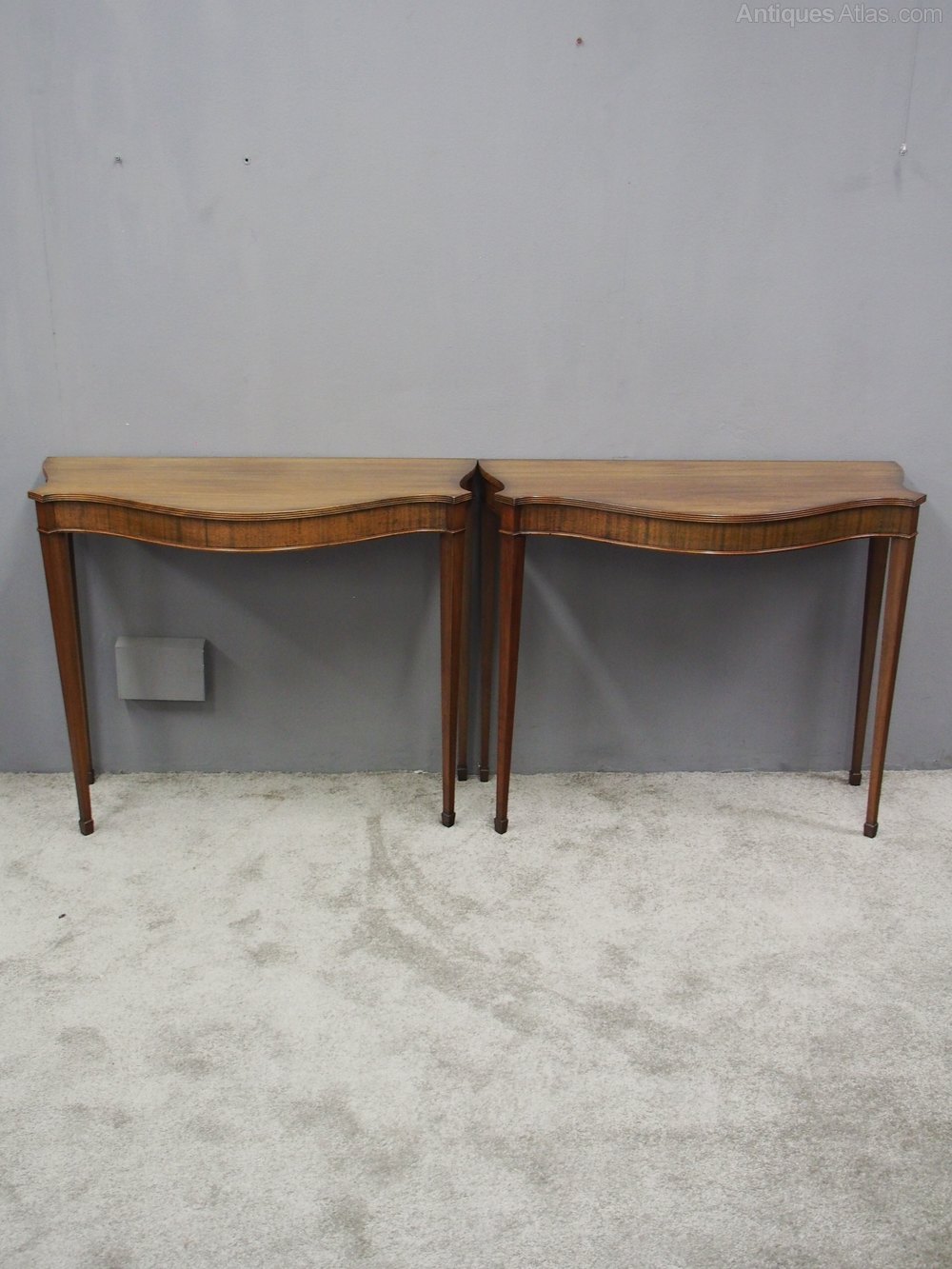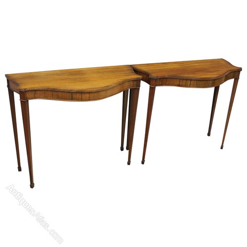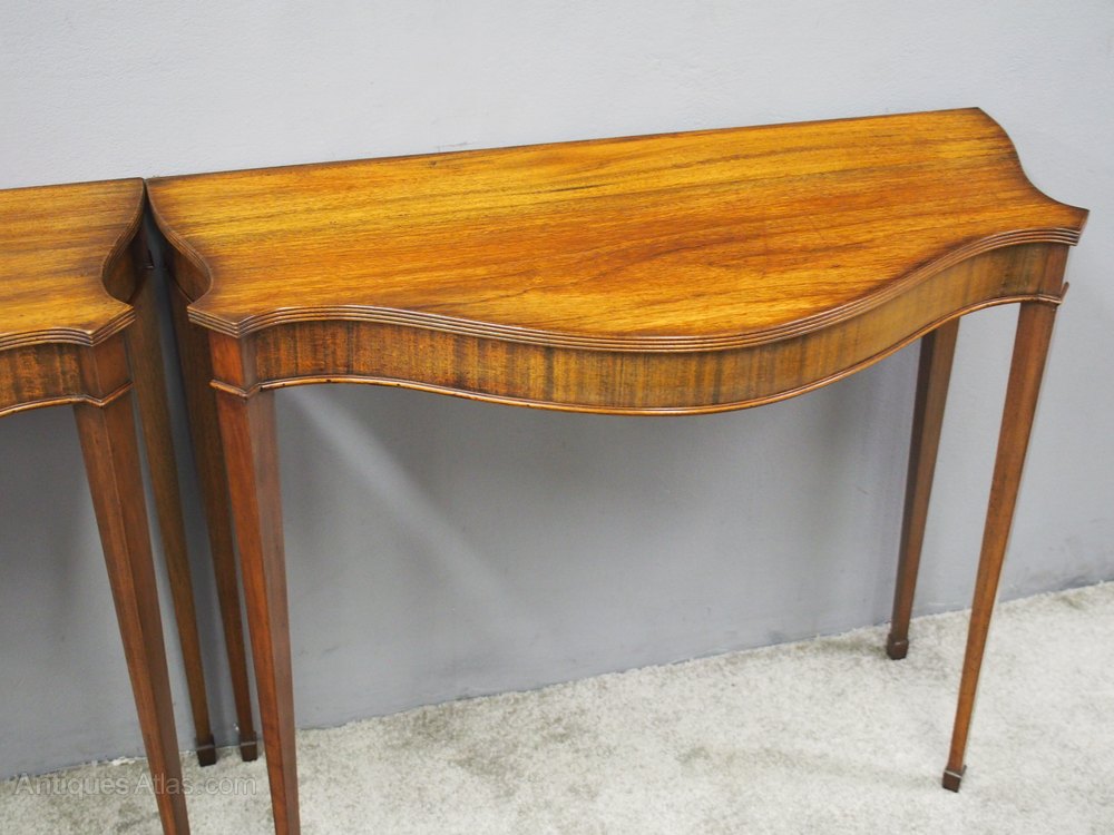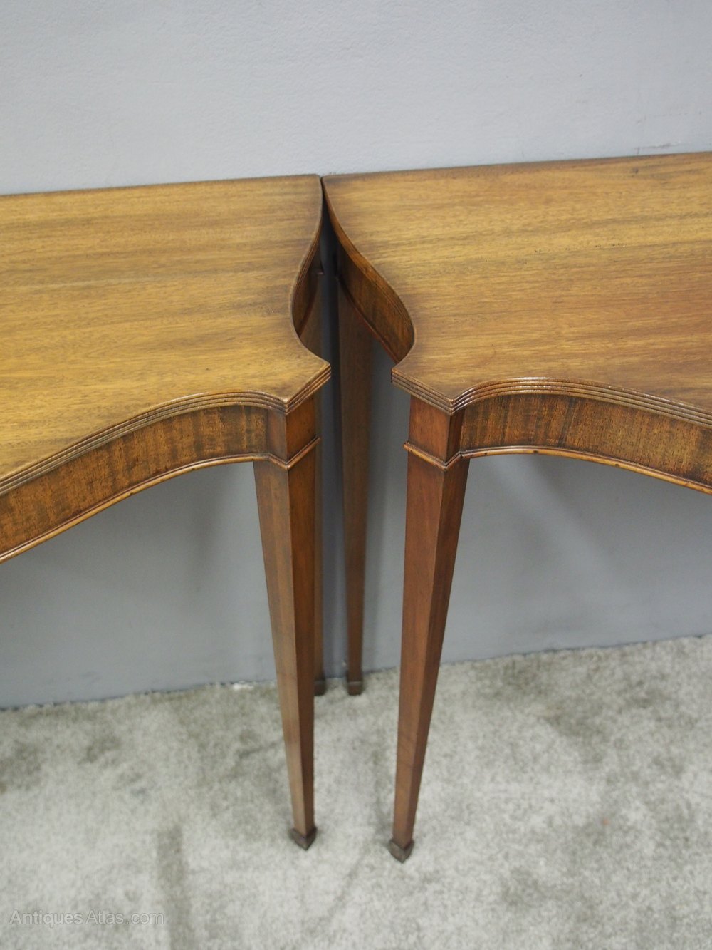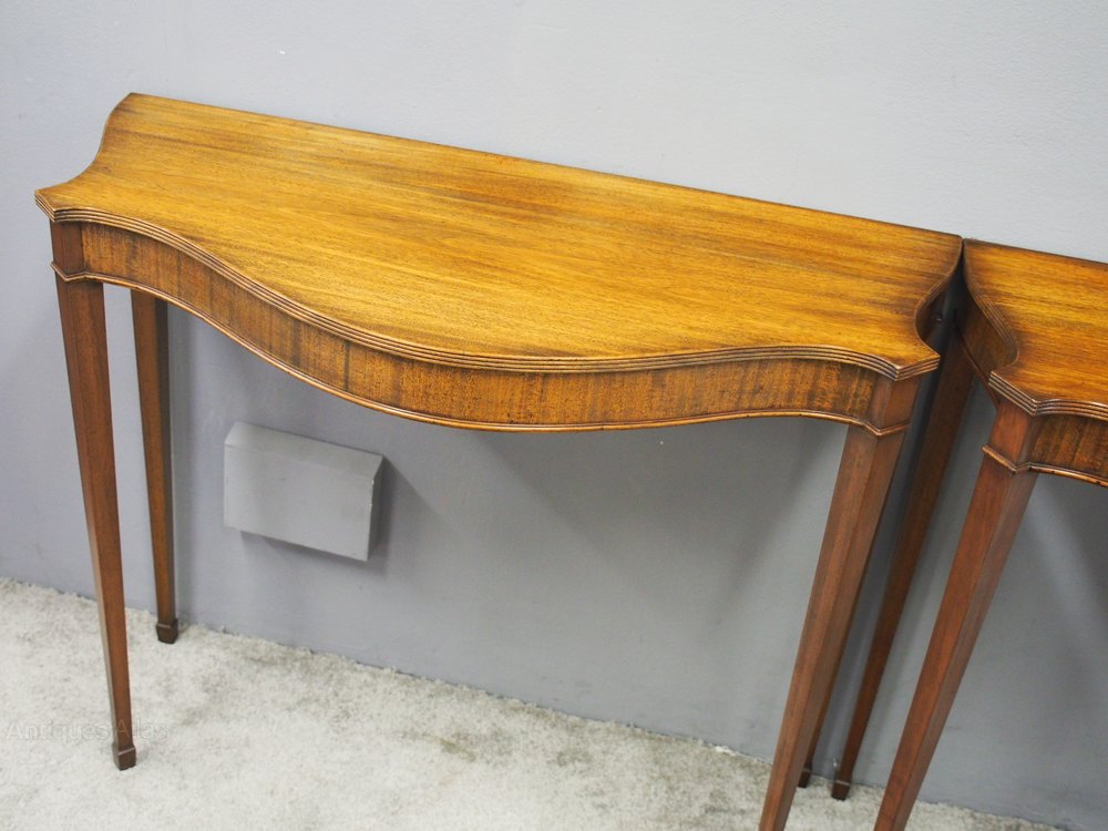 Circa 1930s, unusual pair of Hepplewhite style, serpentine front side antique tables. The shaped tops with ribbed fore-edge over a shaped, beaded frieze to all sides. Standing on square tapering legs and finishing on a spade toe, both with good colour and patination.