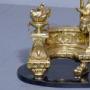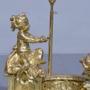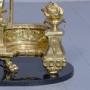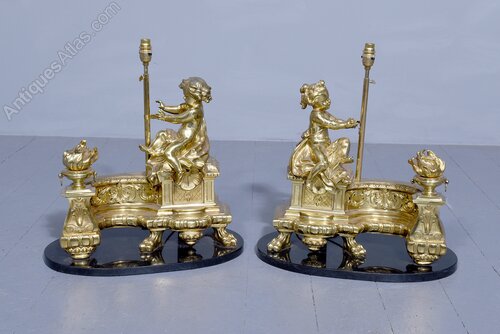 Circa 1880. Pair of large French ormolu (gilded brass) decorative lamps on substantial oval marble bases. The lamps with putti figures on elaborate neo-classical stands with flame decoration supported on lion claw feet on a substantial oval marble bases. Recently rewired with silk covered cord.