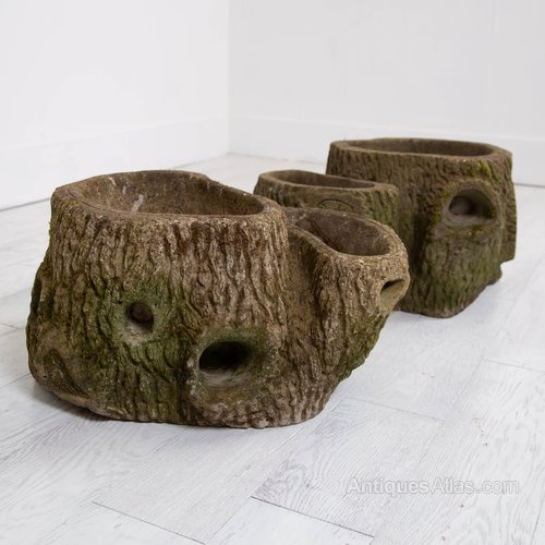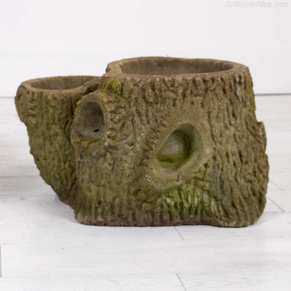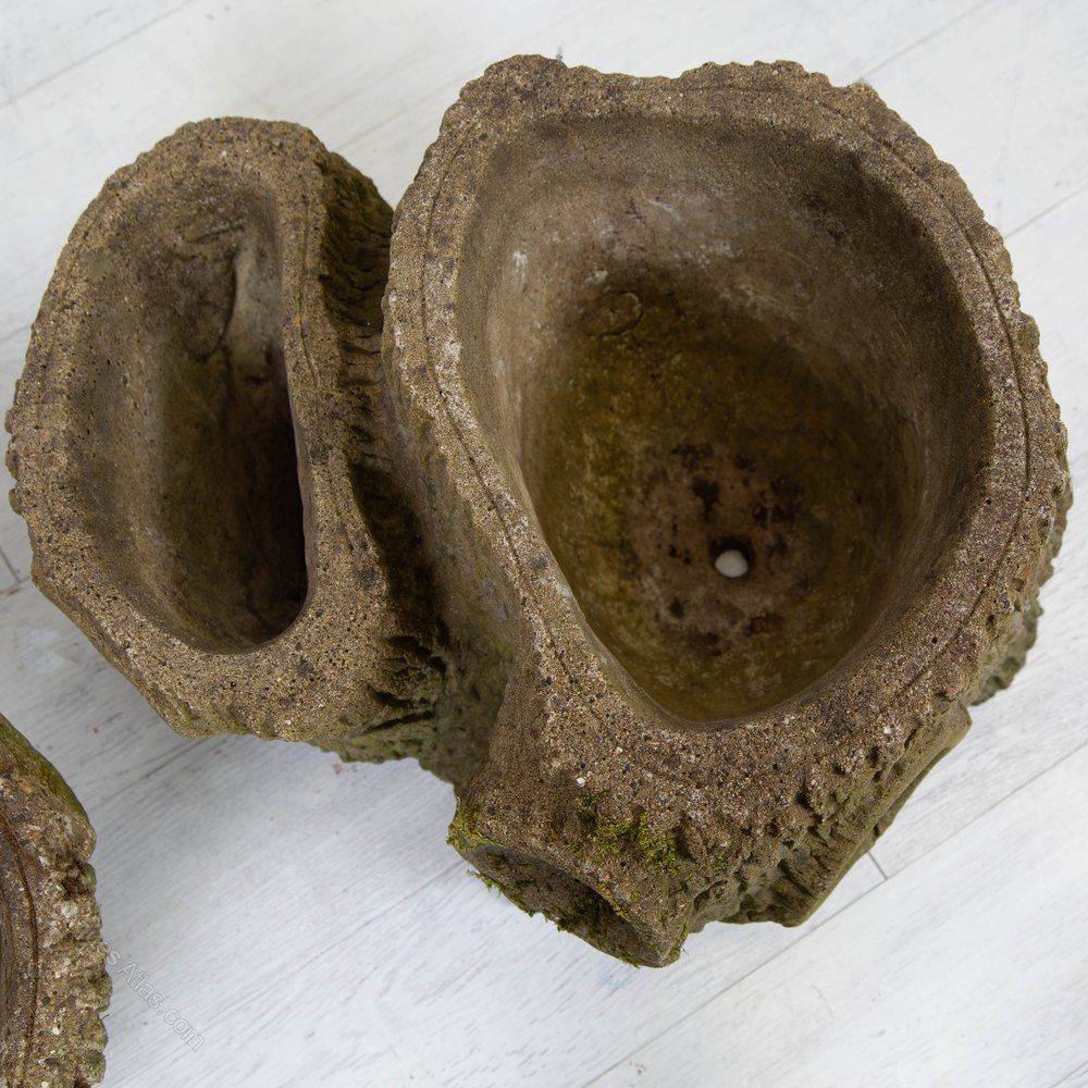From a 1950s home in Yorkshire where they have not moved until we arrived, we have this stunning pair of large faux tree bark planters in concrete which survive in good order with age wear and not much else.