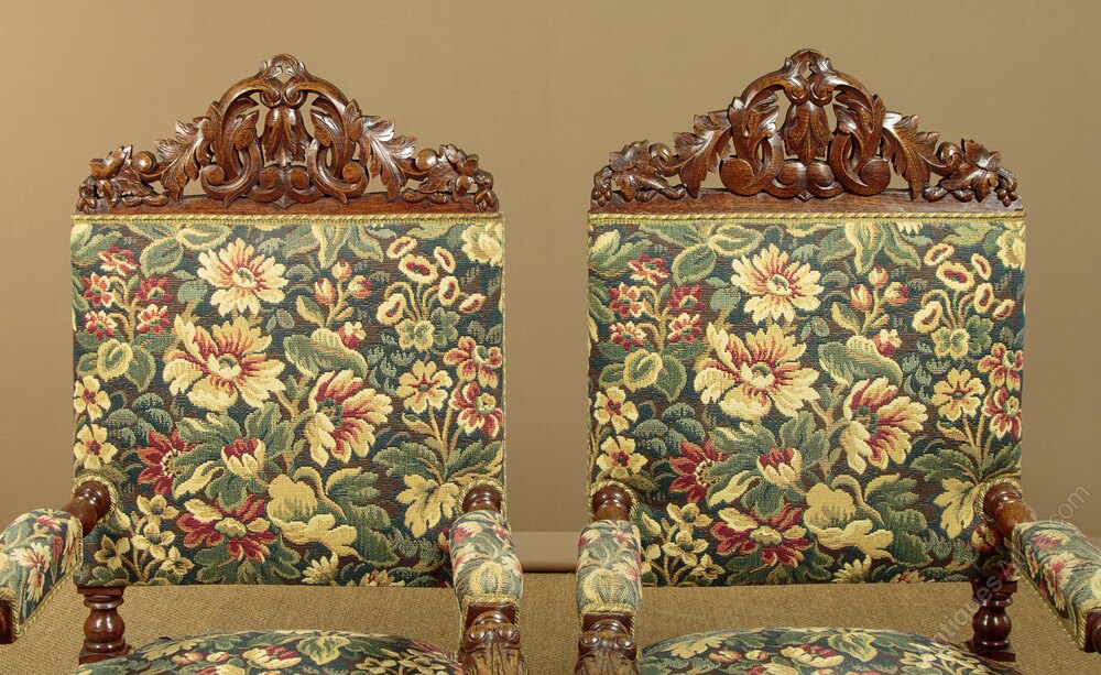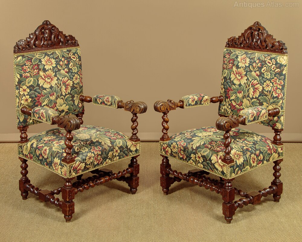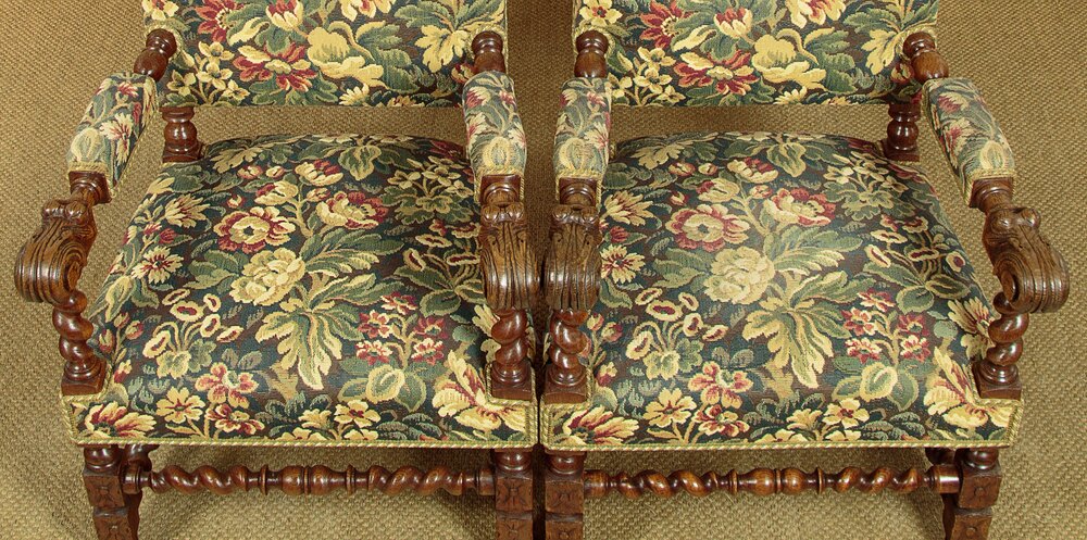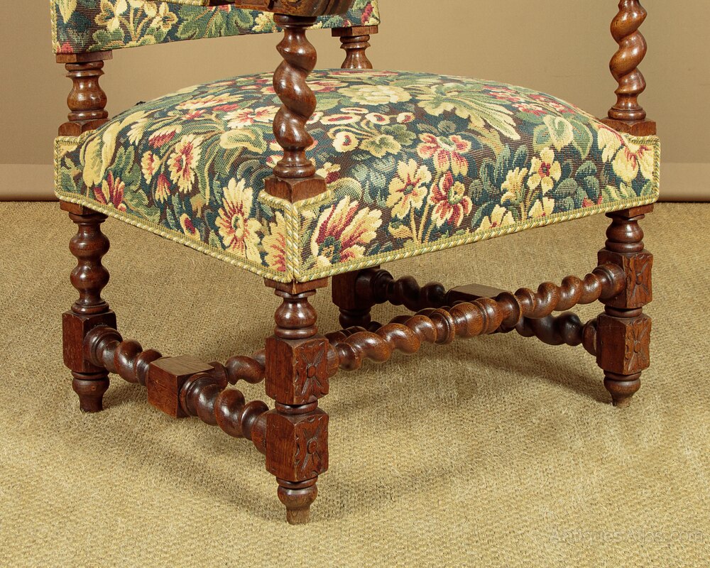 Splendid pair of large 17th.c. style carved oak armchairs c.1900. Tall backrests with a large carved and pierced decoration to the top rail. Turned arms with padded rests and scrolling acanthus terminals on twist carved supports. Over generously proportioned sprung seats. Upholstered in a woven tapestry fabric with dense floral design continued on the rear of the backrest. Turned and block legs joined with twist carved stretchers at he front, sides and centre. Excellent colour and condition, cleaned and waxed in our workshops.