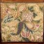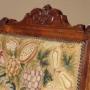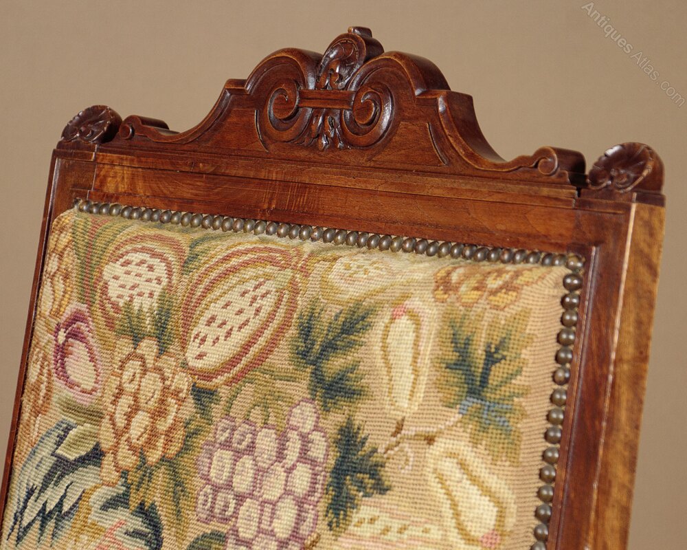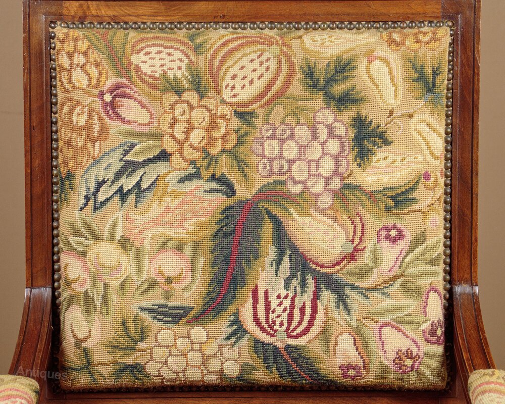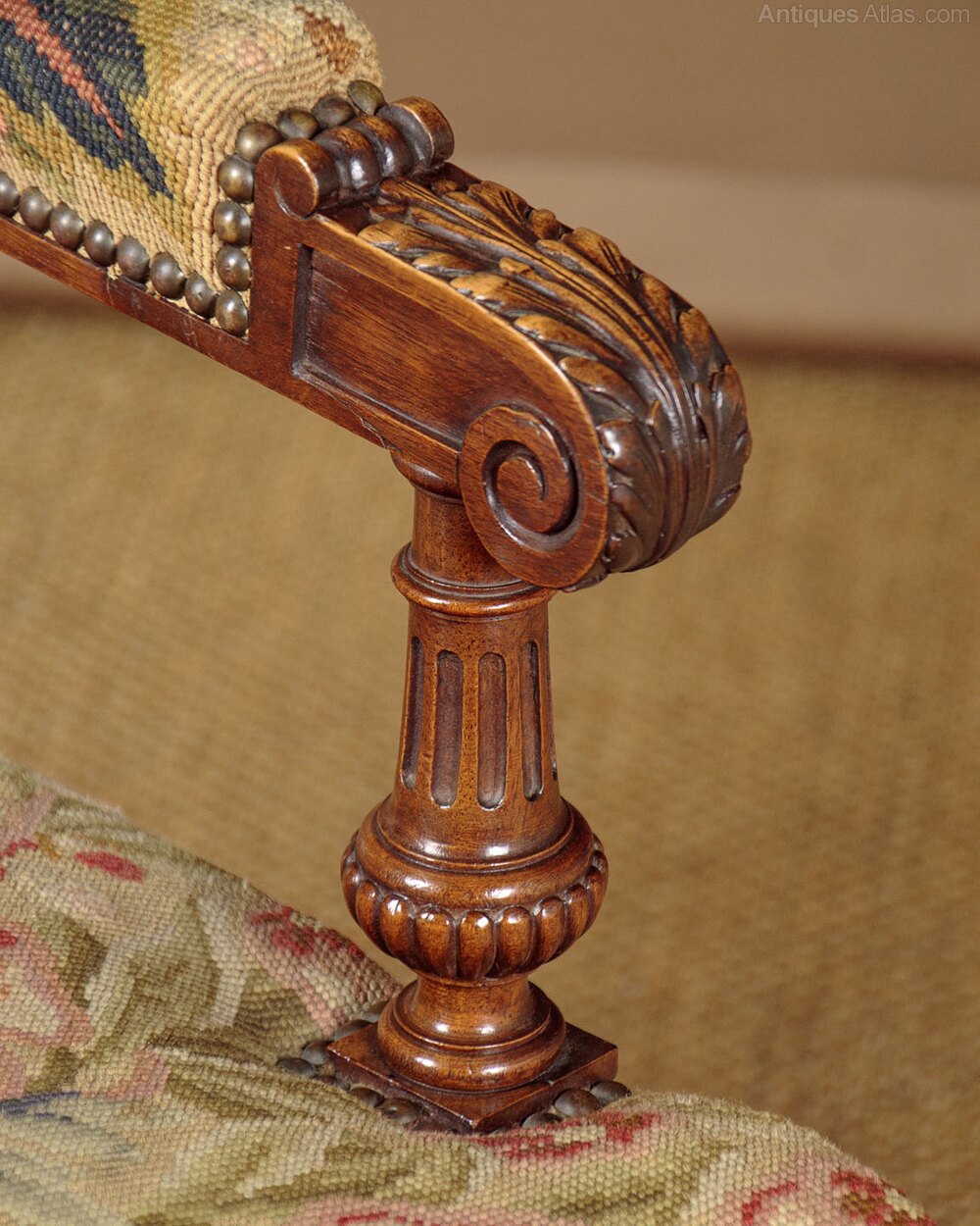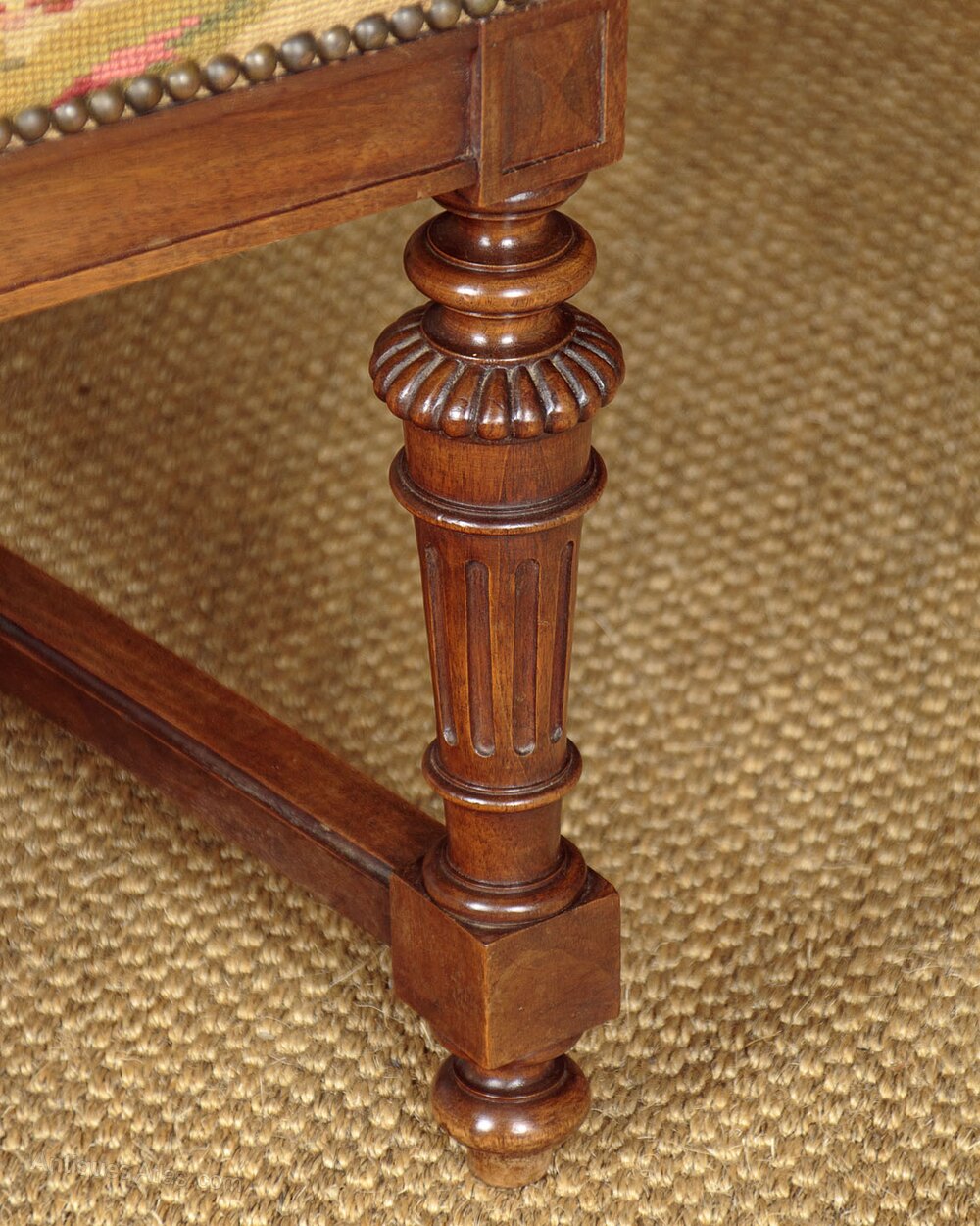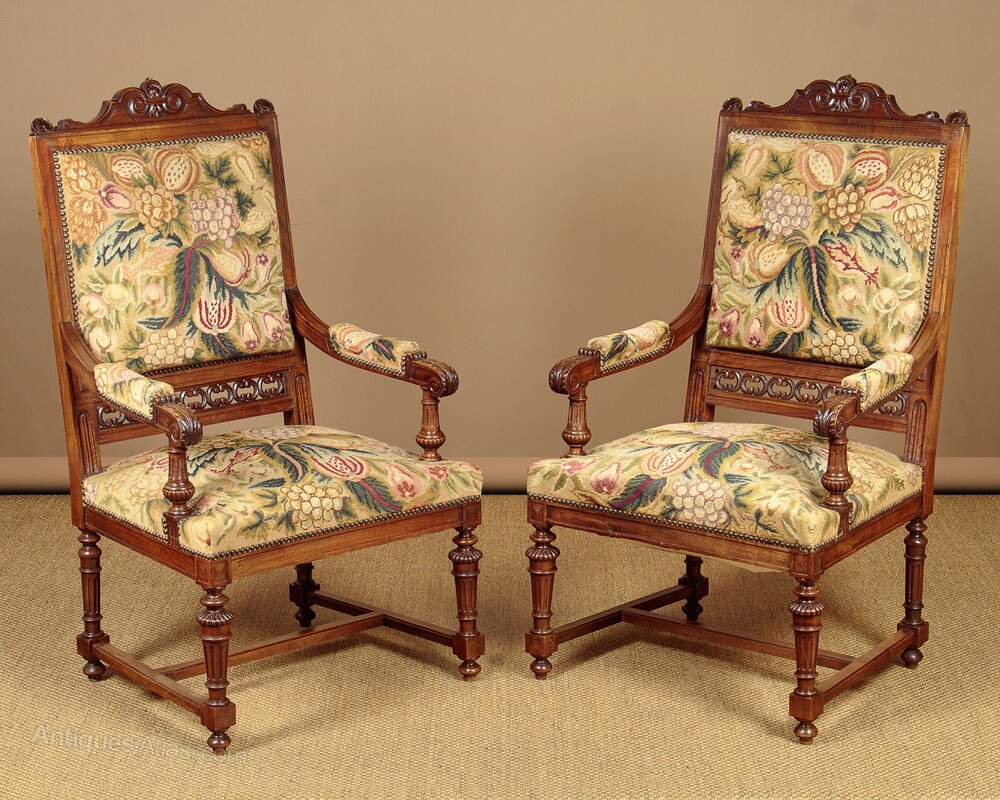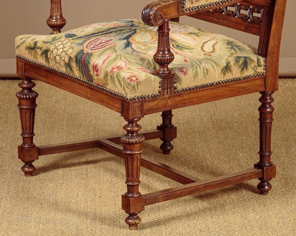 Splendid pair of large walnut armchairs with tapestry covers c.1910. High backs with a crisply carved top rail and a carved and pierced stretcher below the padded backrest. Gently curving arms with padded tops and scrolling acanthus leaf terminals on turned and fluted supports over generously proportioned sprung seats. Very attractive woven wool tapestry upholstery featuring fruits and foliage, note how the design is mirrored across the two chairs rather than simply repeated. Tapering turned and fluted legs front and rear, joined with an H stretcher and raised on turned feet. Excellent condition, cleaned and waxed in our workshops.