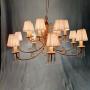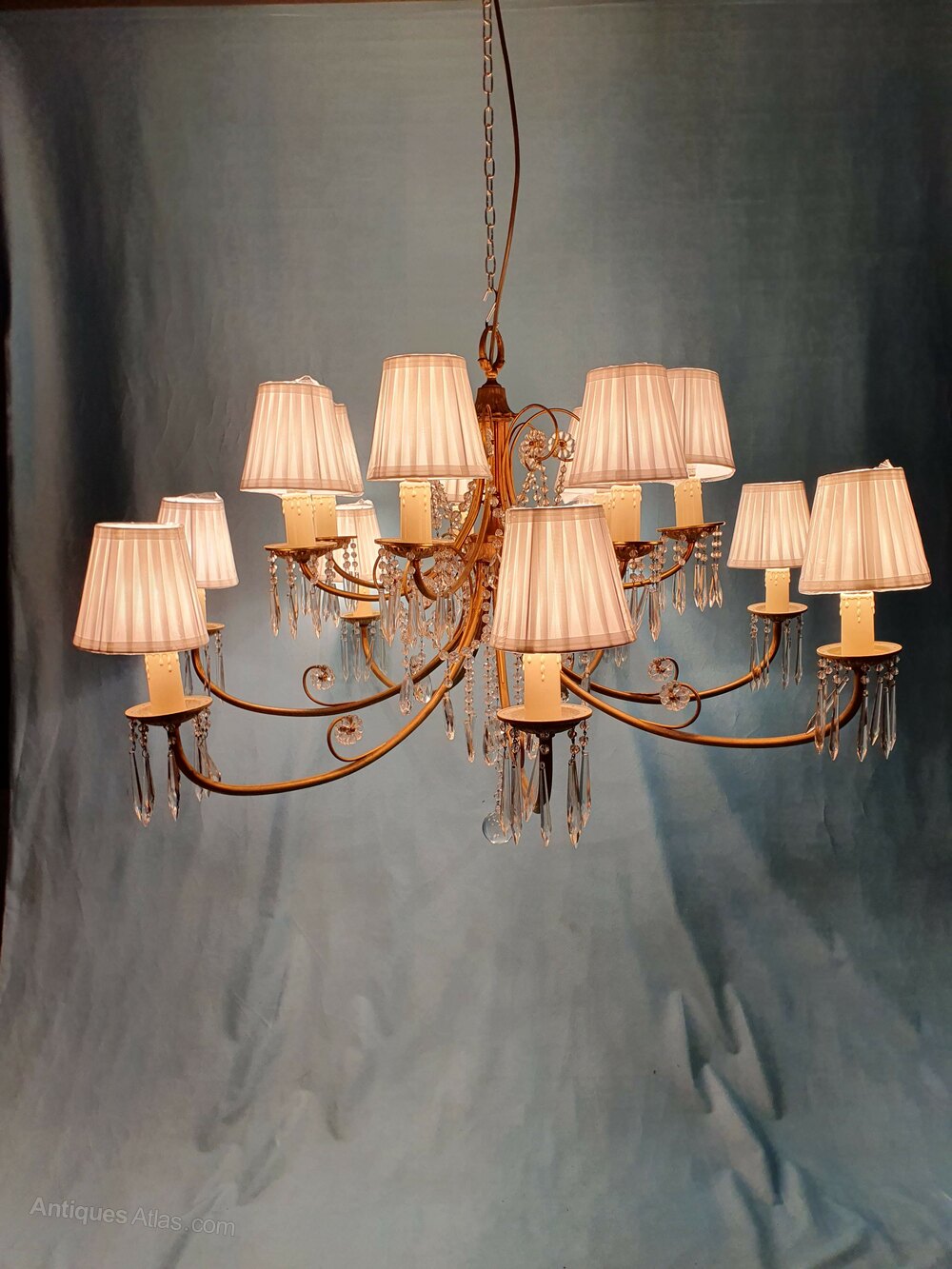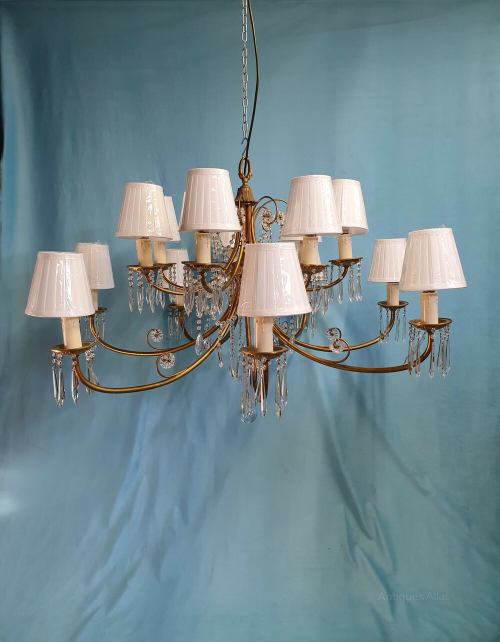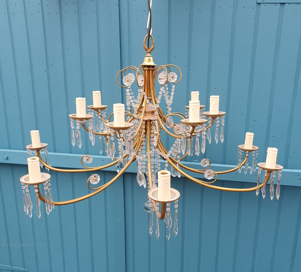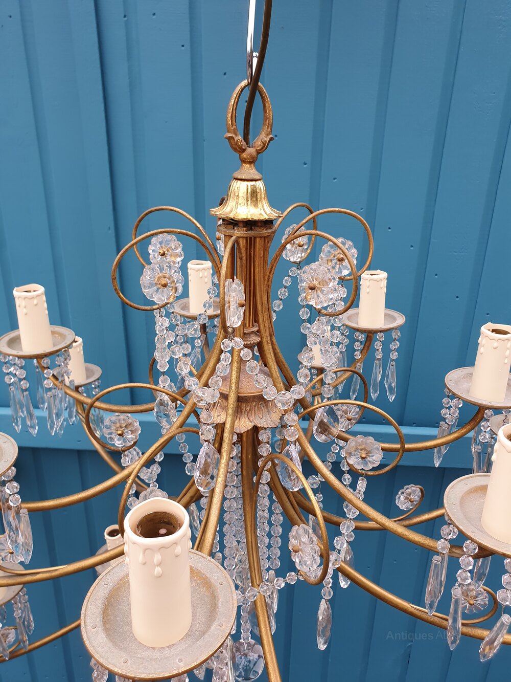 This is an unusual pair of two tier chandeliers. I have never seen this style chandelier with glass crystal and glass flower decoration. This piece has 14 arms, the candle cups are decorated with spikes and the lower arms feature longer spikes. These chandeliers come with rose and chain together measuring 100cm They come with large bayonet bulb holders B 22.