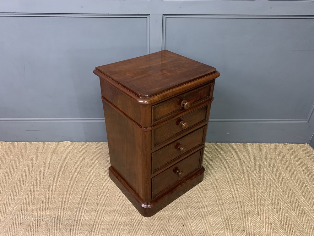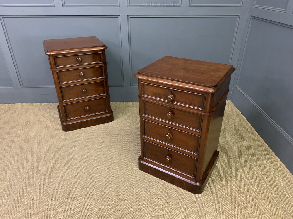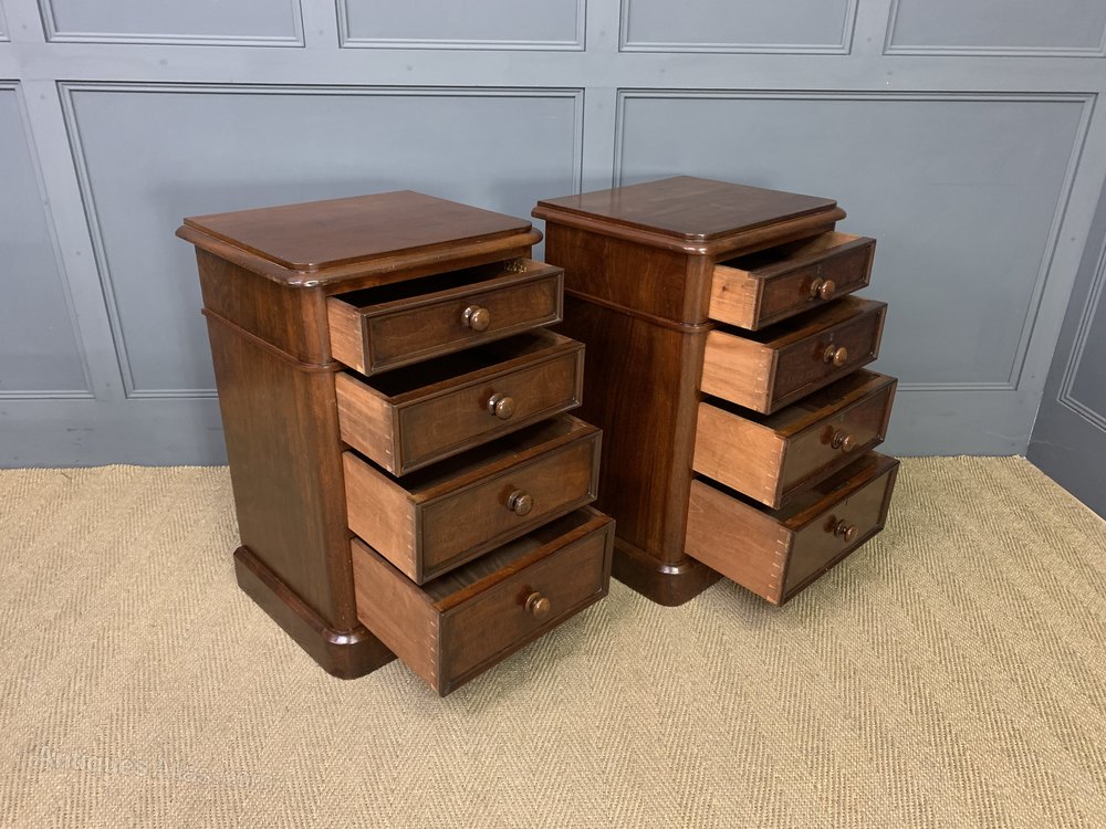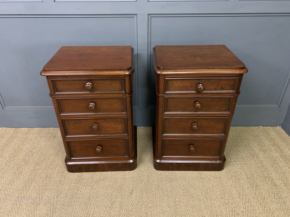 An excellent pair of Victorian period mahogany bedside chests of generous proportions. Each with a series of 4 graduated drawers, each fitted with their original bun handles. Sympathetically refinished in our workshops and now offered for sale in excellent condition. With a great colour and patina , ready to go straight into the home.
