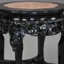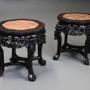 This pair of stands consist of shaped Chinese rouge marble tops recessed into the hardwood tops with ball bead carving to the outer edge.