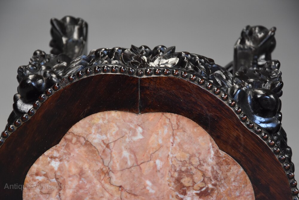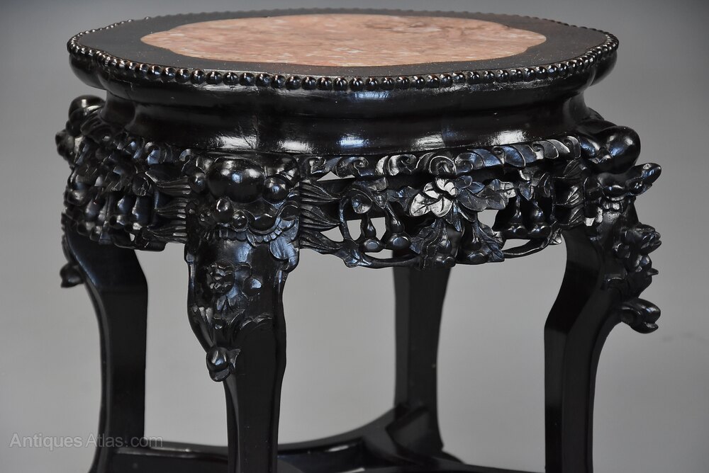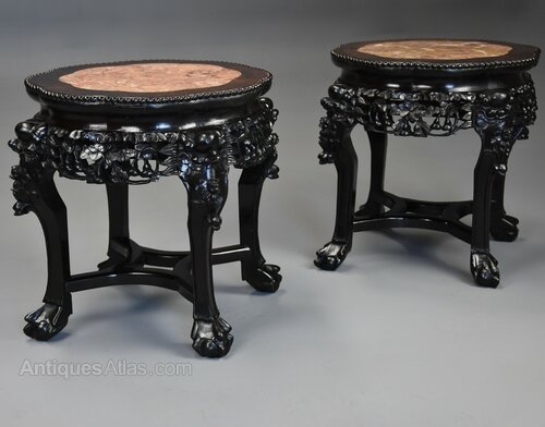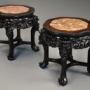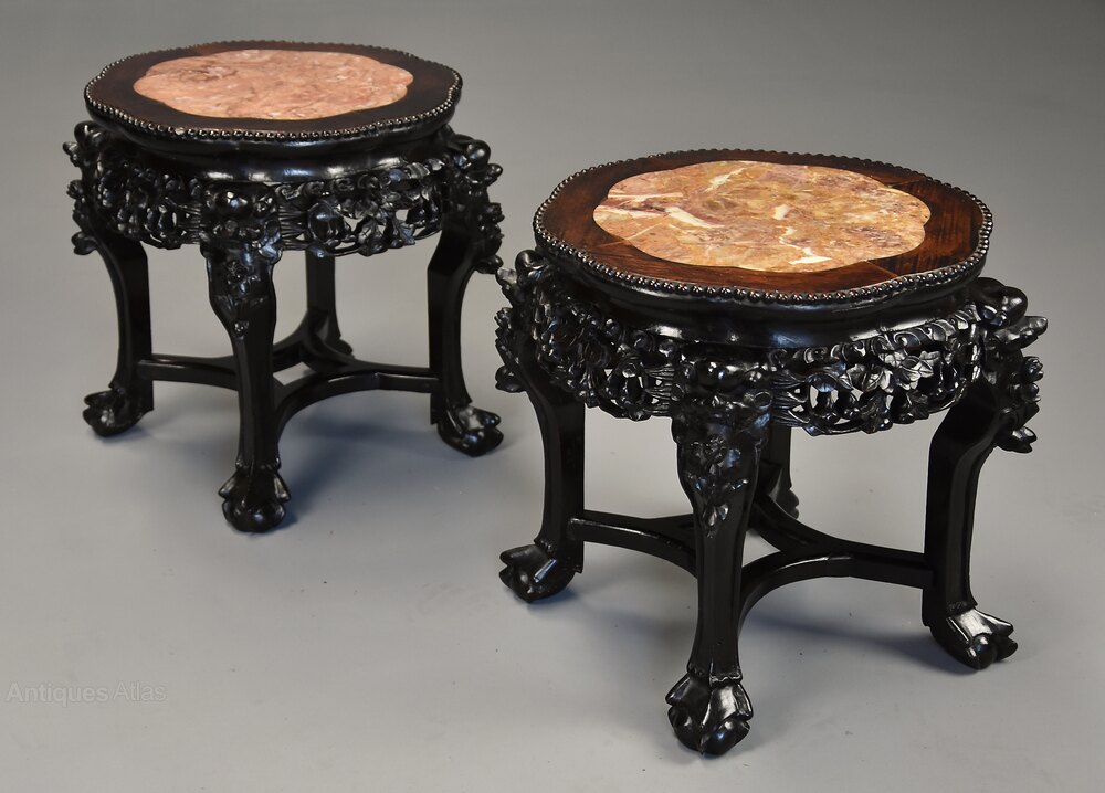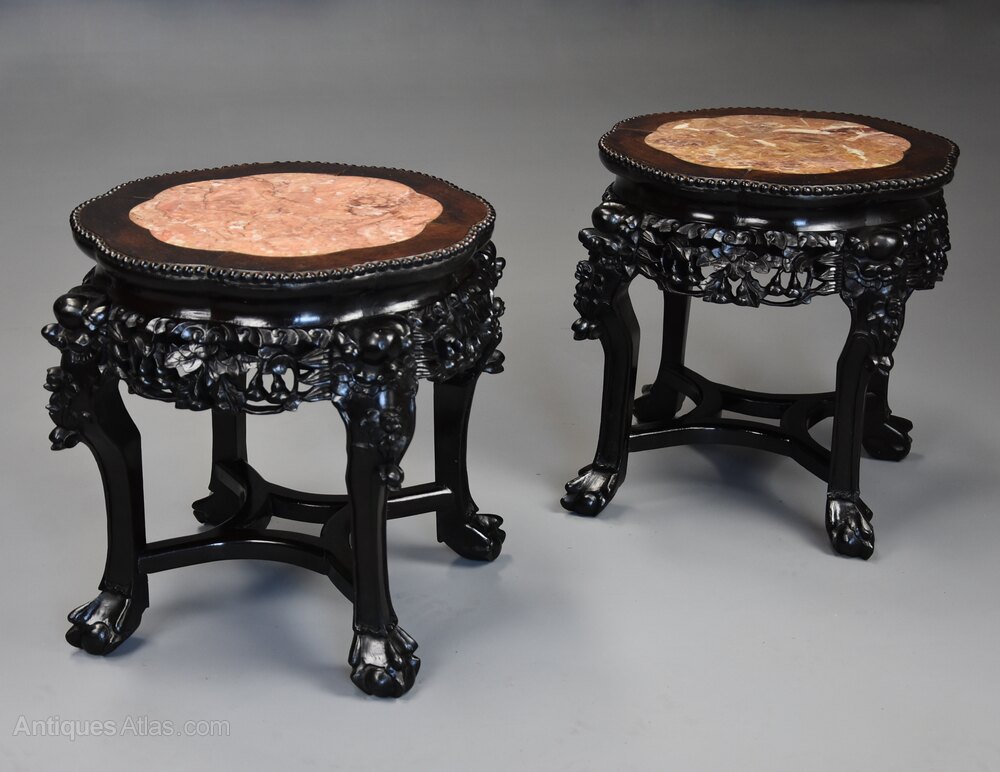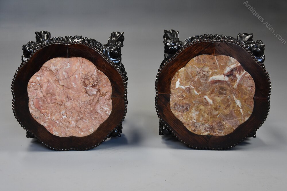 A pair of late 19th century (circa 1890) Chinese hardwood shaped pot stands or low tables with marble inset tops.