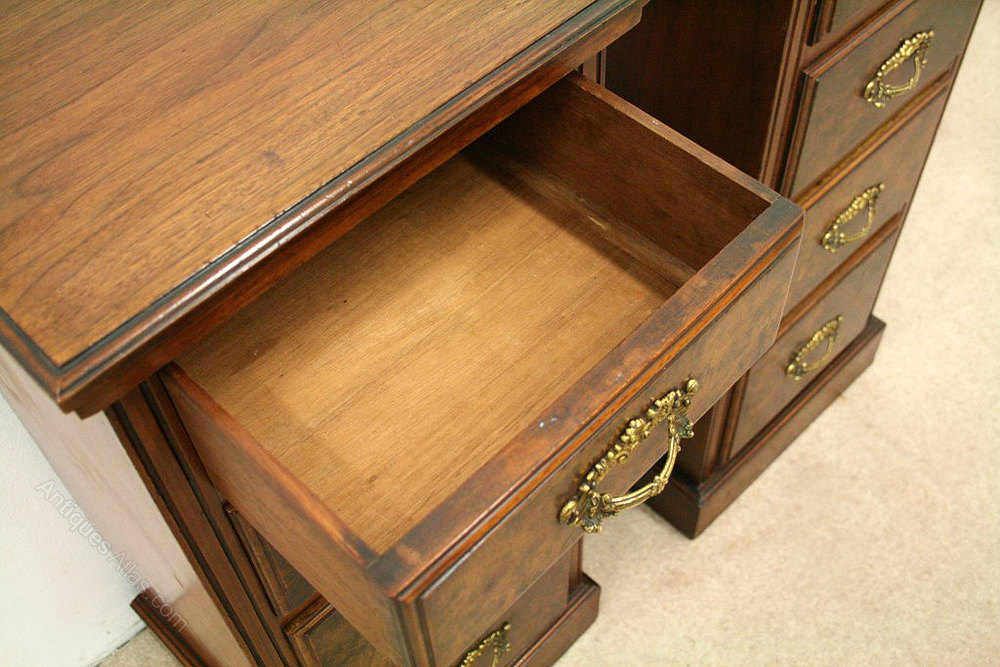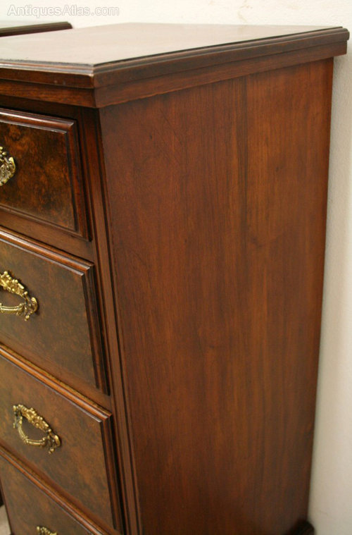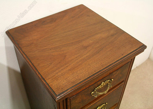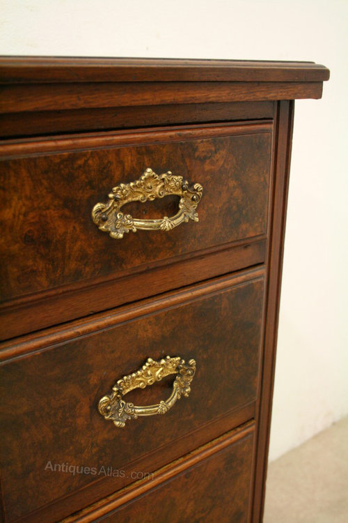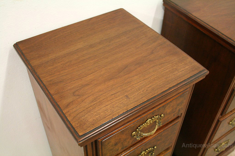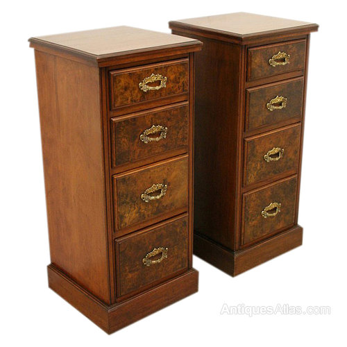 Circa 1880, unusual pair of late Victorian walnut and burr walnut bedside pedestal lockers (adapted). The solid walnuts tops have a moulded edge, above four graduating drawers with burr walnut fronts and very stylish gilded Rococo cast handles. Each side of the drawers there are a stylish facing. Beneath the bottom drawer is a moulded edge and an enclosed plinth. Great colour and good patination.