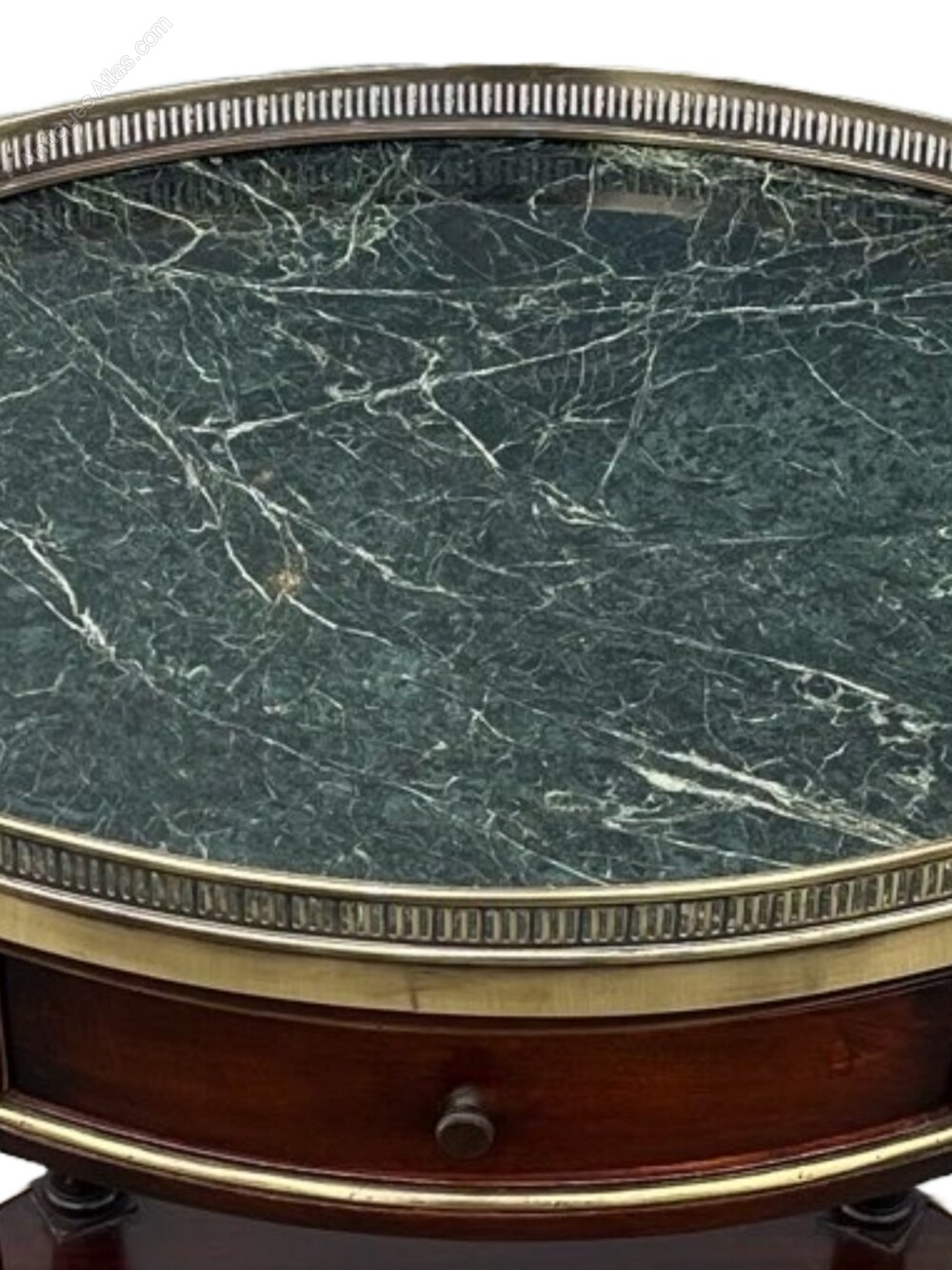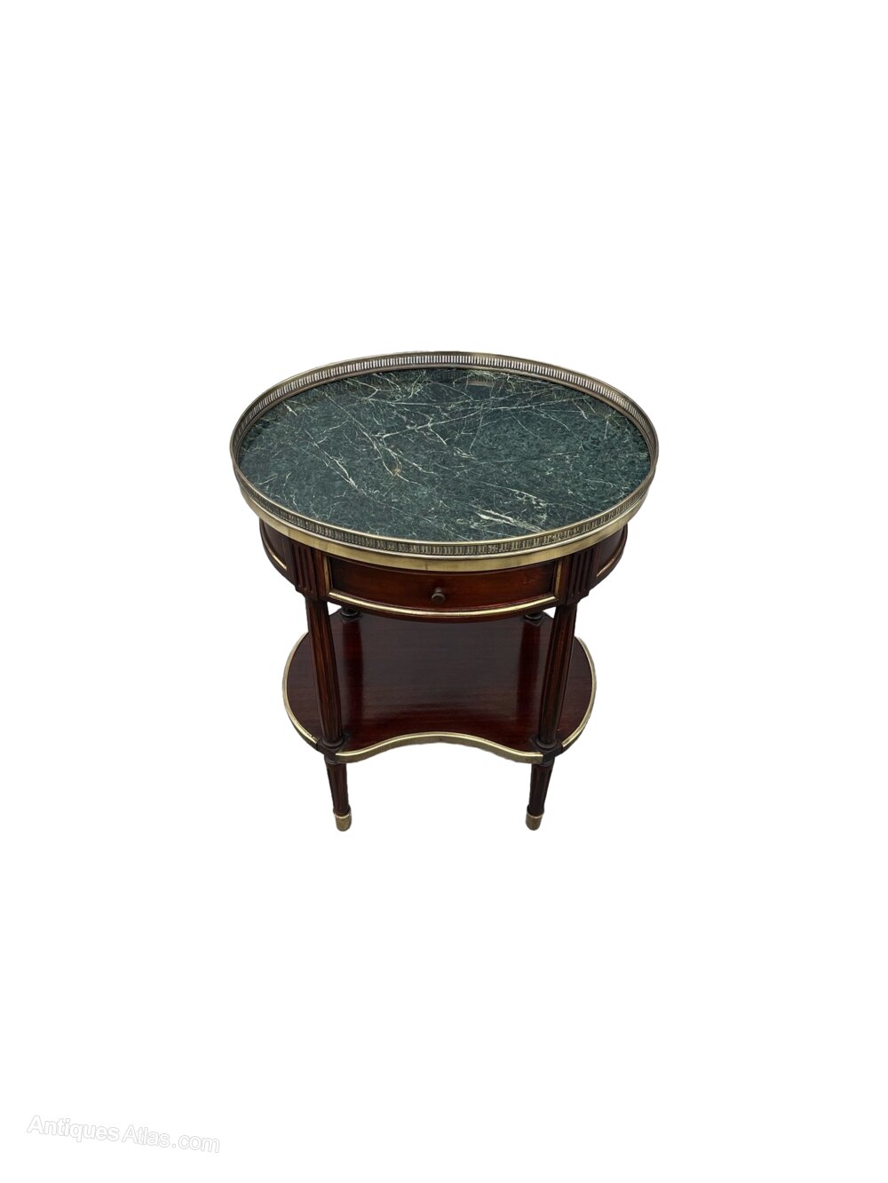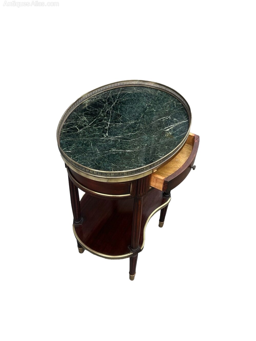 A fine pair of bedside cabinets / side antique tables in the Louis XVI style. Each with green marble tops and pierced brass galleries. Marble tops are detachable.