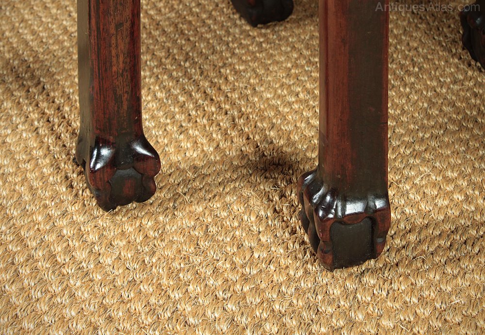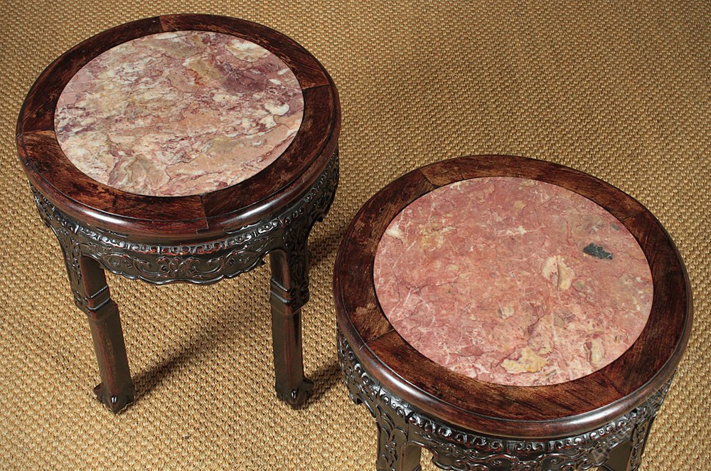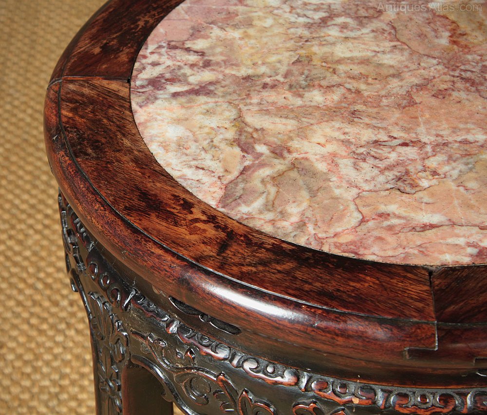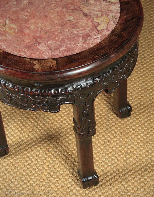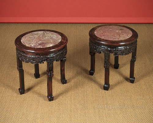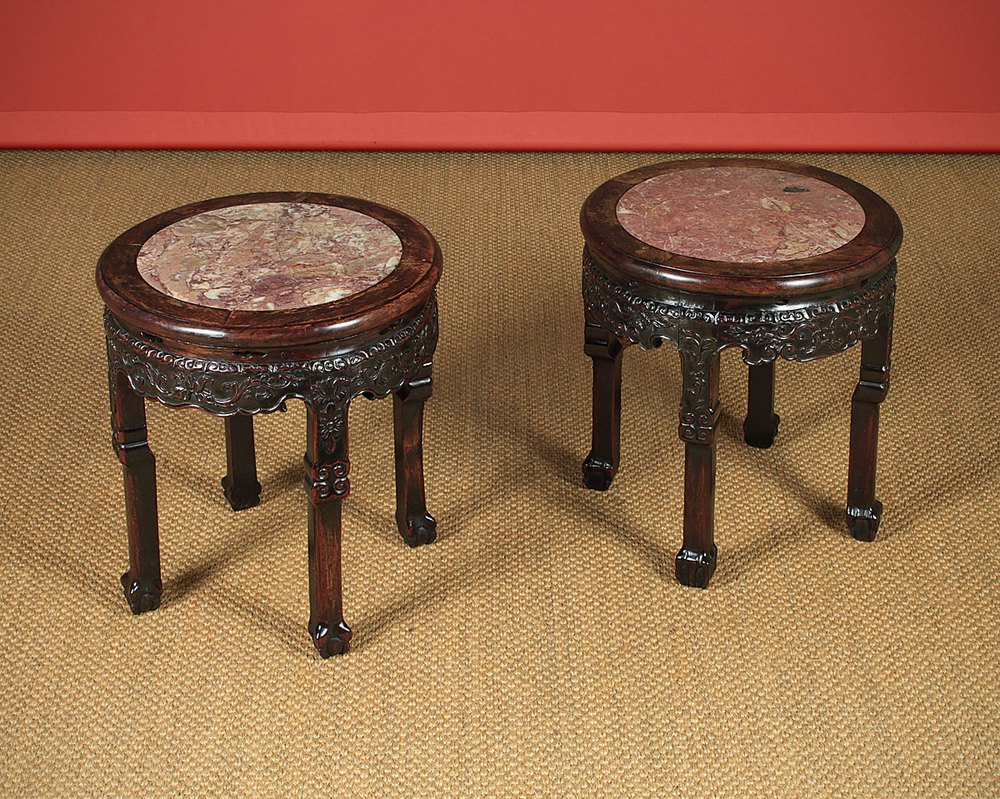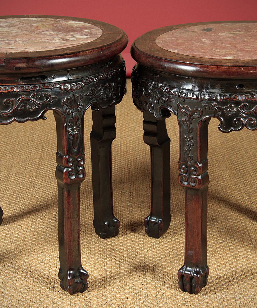 Matched pair of late 19th.c. oriental rosewood and marble top urn stands or low lamp antique tables c.1890. Very slight differences in height and detail but both with rose marble tops within a moulded rosewood surround, over foliate carved aprons raised on straight legs with carved detail and paw feet. Very good condition, cleaned and waxed in our workshops.