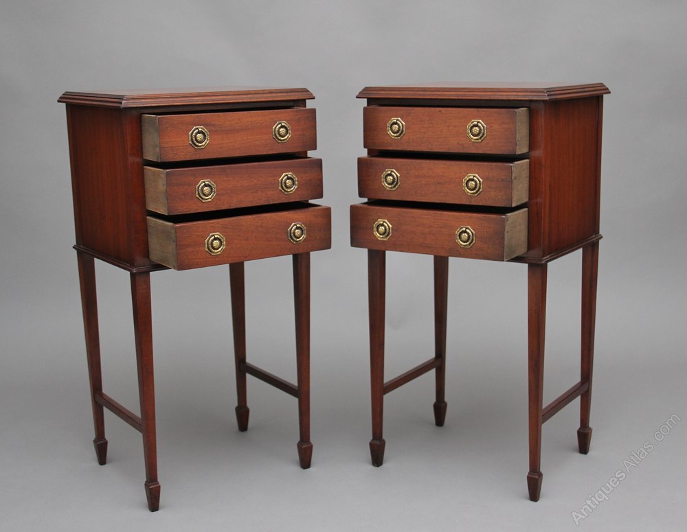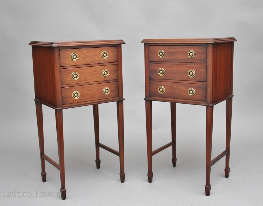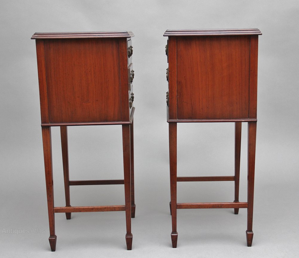 Pair of mahogany bedside cabinets, the thumb moulded edge tops decorated with herringbone inlay, above three oak lined drawers with octagon shaped brass ring handles, standing on square tapering legs with spade feet, united with side stretchers. Circa 1960.