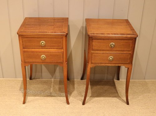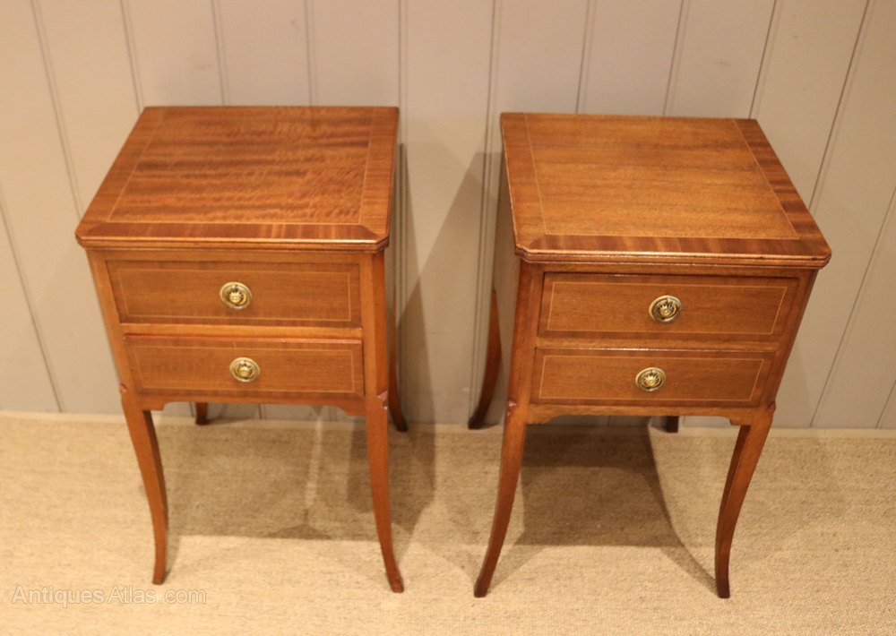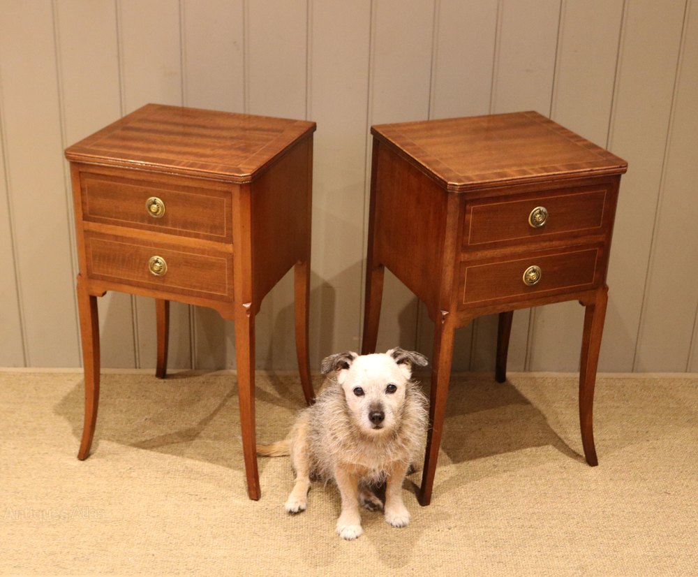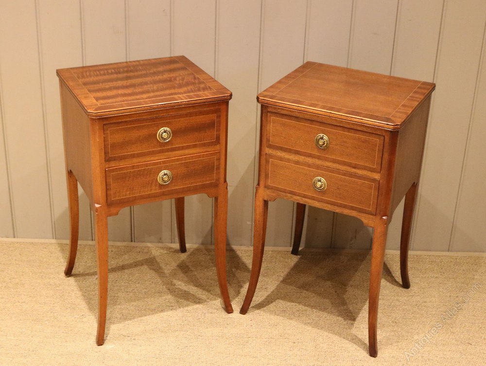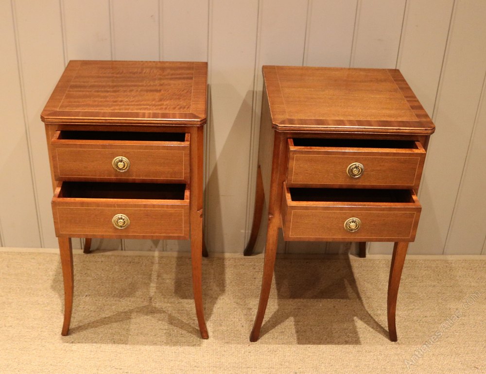 Pair of mahogany bedside cabinets having crossbanded tops , with two drawers , raised on outsplayed legs