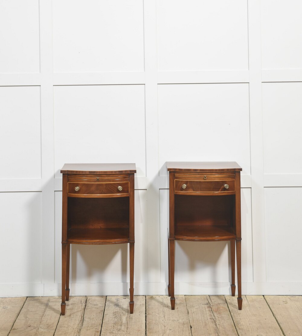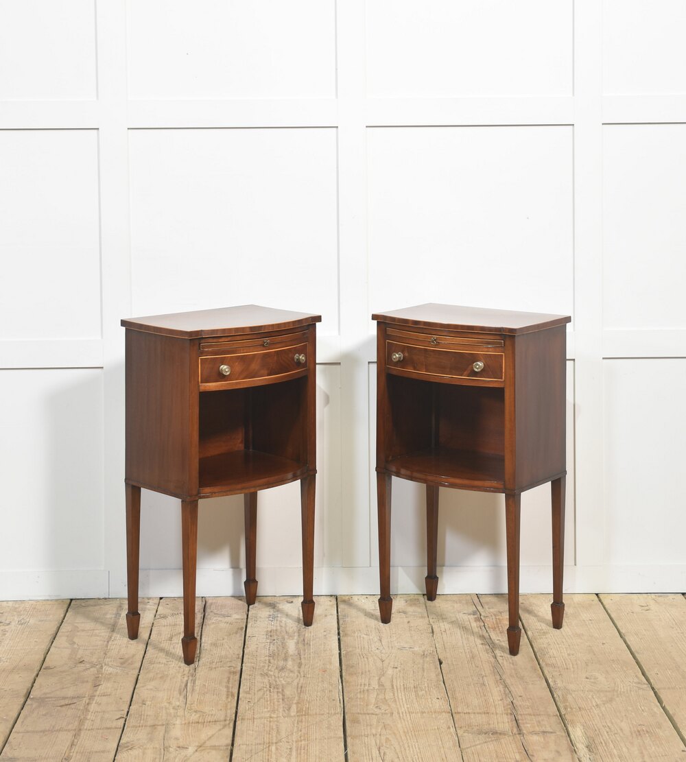 A fine pair of antique mahogany bedside antique tables, crafted with elegant simplicity and timeless charm. Each table features a beautifully figured mahogany top with a shaped front, a practical pull-out brushing slide above a single drawer fitted with brass knob handles, and an open lower shelf for additional storage. Standing on slender tapered legs with spade feet, these antique tables showcase refined craftsmanship and classic design.