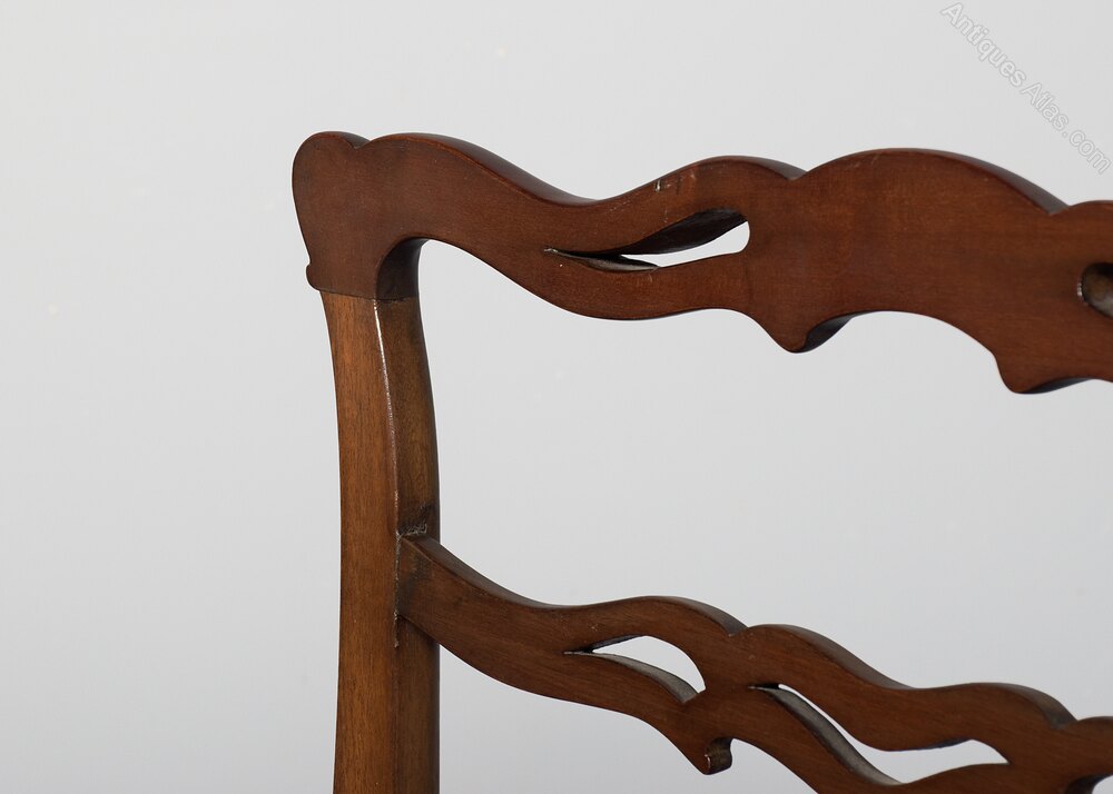 Circa 1920s. A pair of George III style mahogany ladder-back chairs, the shaped and pierced cresting rail with three pierced rails beneath, the curvaceous arms supported on shaped uprights, the drop in upholstered seat with simple seat rail, back legs are square and slightly out swept, the front legs are square with a small chamfer on the inside, all braced by conforming stretchers.