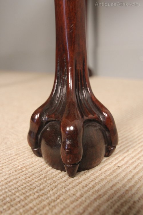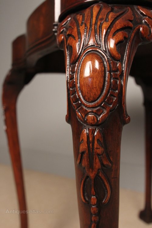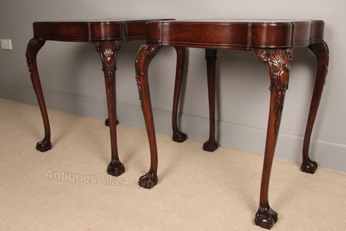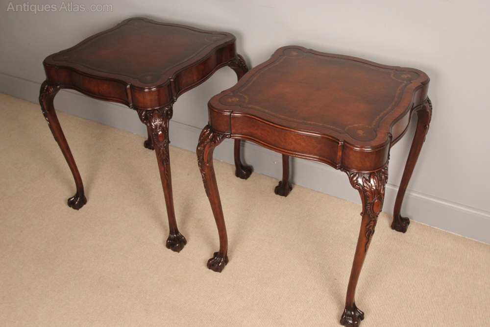 A true pair of Mahogany serpentine sided lamp antique tables, having inset gilt tooled leather tops in brown, raised on scrolled shaped legs and terminating in ball and claw feet. These well proportioned antique tables finished to all four sides enabling them to stand in a centre of a room. A highly versatile pair of 1920's tables in excellent condition throughout.
