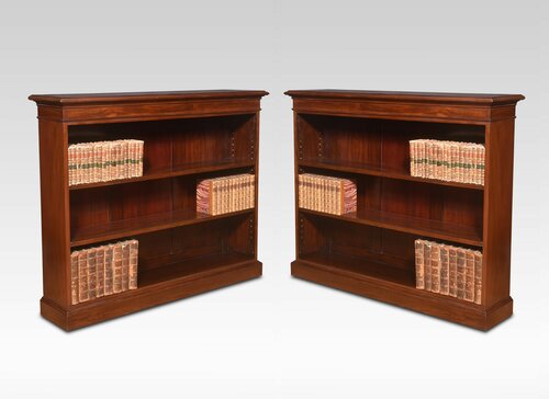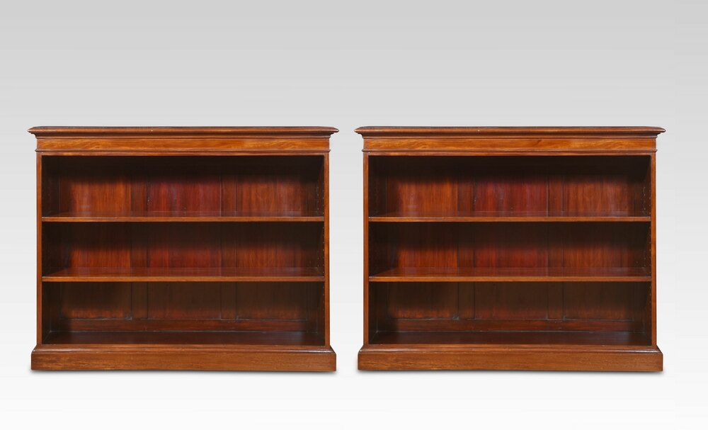 Pair of mahogany open bookcases, the large rectangular top with cross banded moulded edge. Each bookcase having two adjustable shelves. All raised up on a plinth base