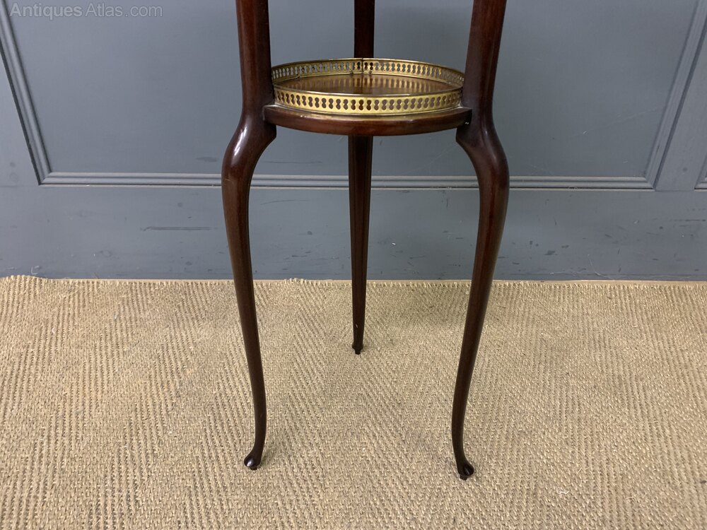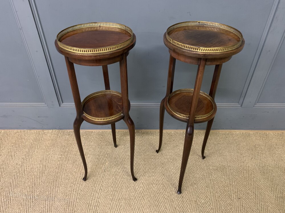 A lovely pair of early 20th century mahogany stands, or jardiniere stands. Well constructed in solid mahogany with lovely sweeping cabriole legs. With 2 tiers, each fitted with a pierced brass gallery. Offered for sale in very good original condition, ready to go straight into the home.