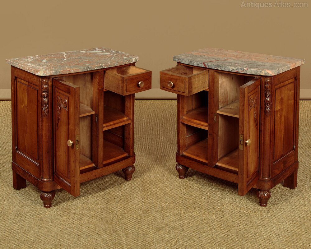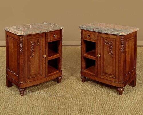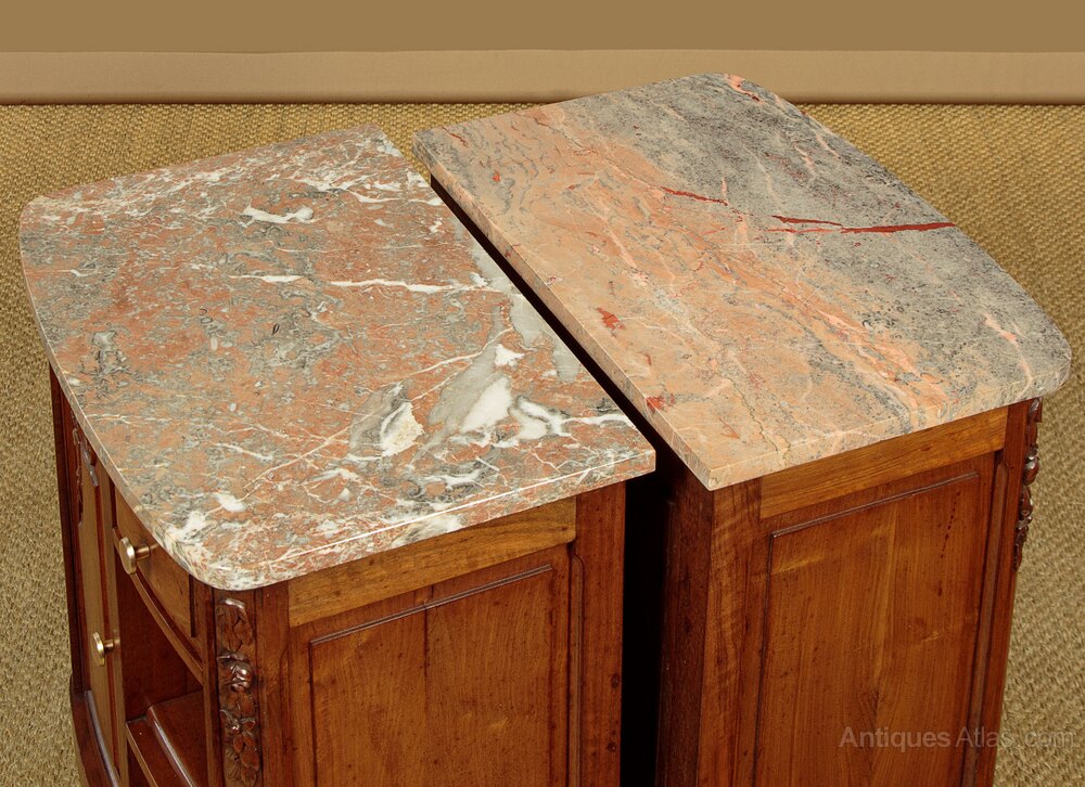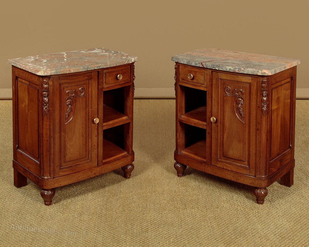 Quality pair of Art Deco era walnut and marble top bedside cabinets c.1930. Well figured pink and grey marble tops with a slightly bowed front edge and rounded corners. Over walnut cabinets each with a small drawer, a cupboard (internal depth 10") and open shelves. A true pair with left and right hand opening doors and the drawers positioned to be closest to the bed. Attractive carved floral detail to the front, original brass handles. Raised and fielded panels to the doors, sides and rear. Raised on turned and carved front feet. Excellent colour and condition, cleaned and waxed in our workshops.