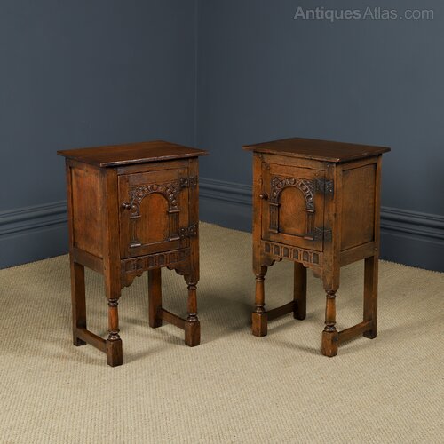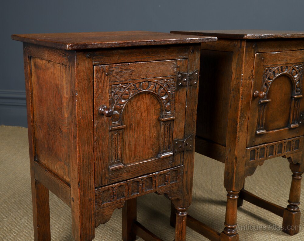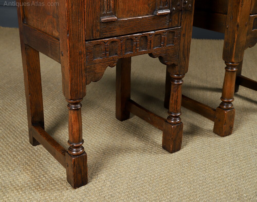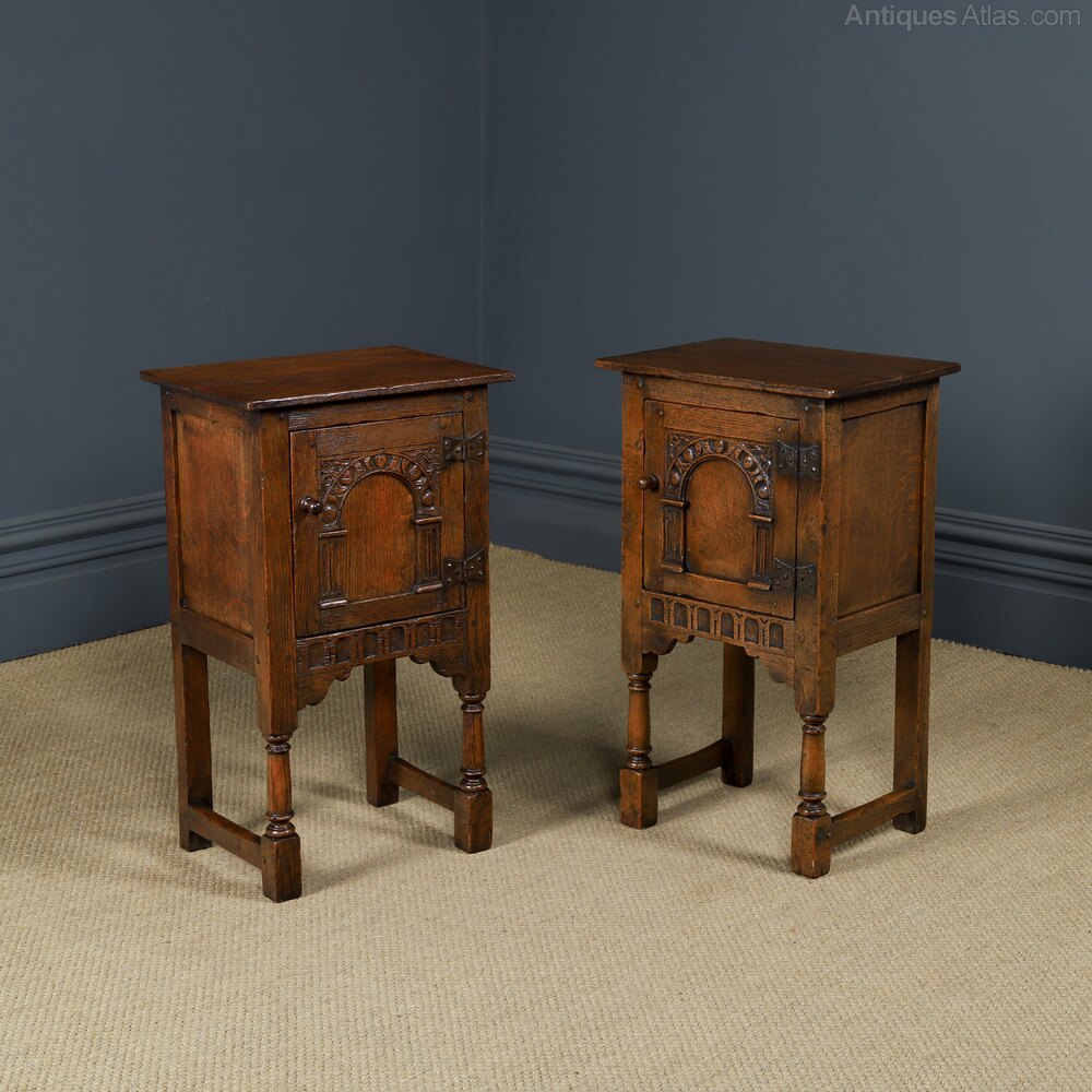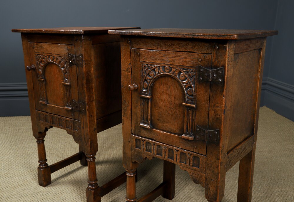 This is a fine quality English Old Charm pair of oak bedside tables, in the style of 16th century period, with Tudor inspired carvings, circa 1950, in excellent original condition. We believe this pair of oak tables originate from Wood Brothers, who created “Old Charm” furniture, which originated in 1920 onward, inspired by the craftsmanship of the English Tudor and Elizabethan eras. The pair of bedside tables are in the style of the English Tudor period, which dates from between 1500 to 1530. The pair of oak bedside tables feature a “flowerspotte’ carved arch panel, supported by Corinthian columns on pedestals. The door retains the original iron “butterfly” hinges, which were typical of this period. The cupboard door open to reveal a useful storage area - they are ideal as a pair of lamp or bedside tables. Below, is a carved ed frieze, supported by corner spandrels. The oak bedside tables are raised on ring turned legs, united at the base by a stretcher, between the legs, which terminate on block feet. The pair of oak side tables are constructed in the traditional manner with mortice and tenon pegged joints, inset side panels.