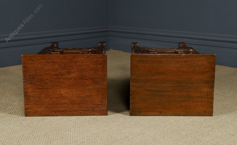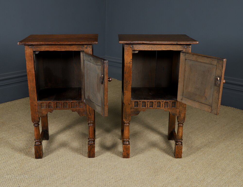 Condition This is a fine quality vintage English pair of oak tables, in the style of 17th century period, featuring a drawer and pot-board ideal as lamp or bedside tables, in excellent original condition. The tables have been cleaned and wax-polished by hand in our workshop, to a professional standard, therefore the colour and patination is of a high standard. Nominal old use marks to the tops and leading edges, but nothing significant considering their age. The frame is constructed of solid oak and retain their original knobs and iron hinges. There are no breaks to the legs or frame. The pair of oak side tables are solid in joint and ready to be used.
