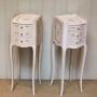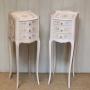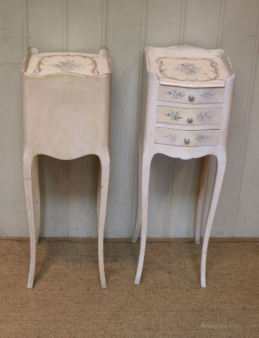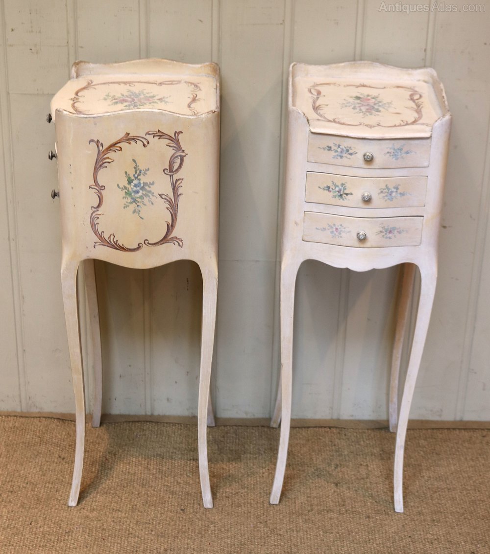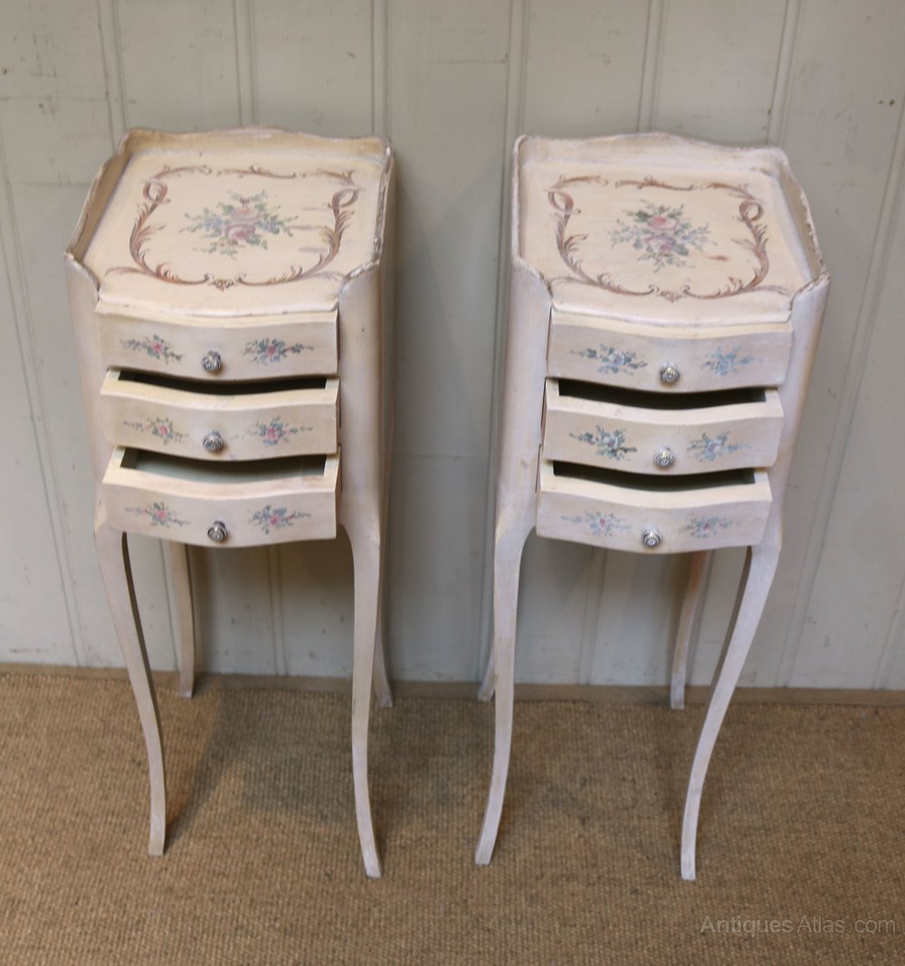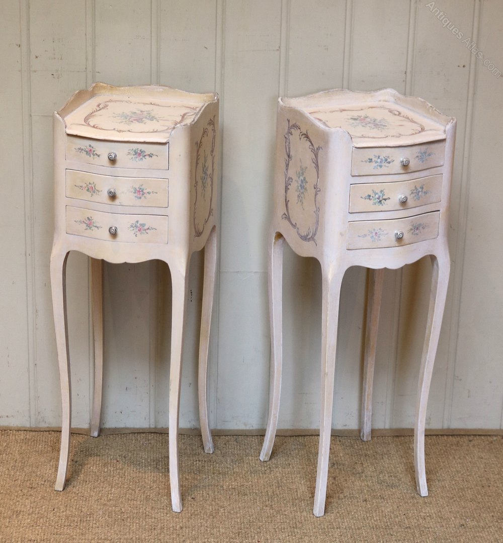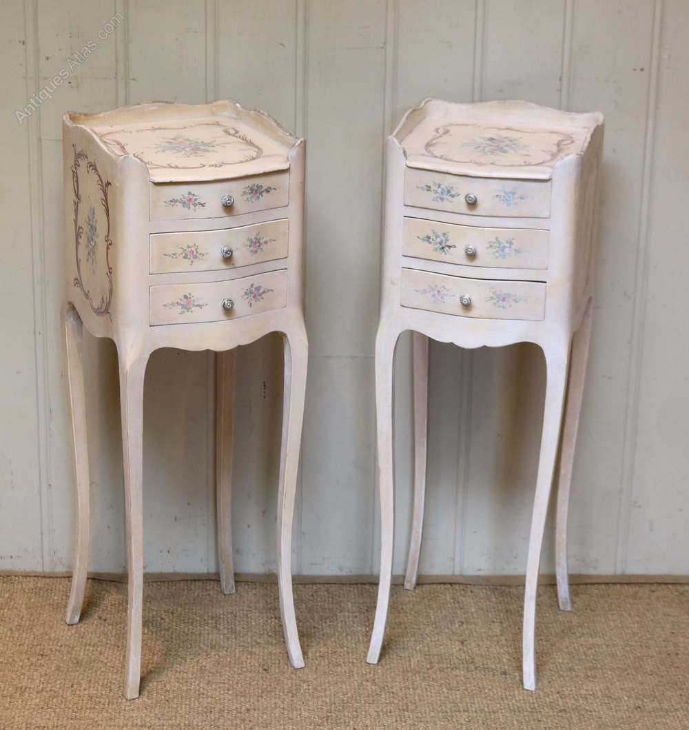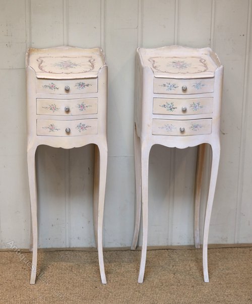 Pair of small proportioned floral painted bedside cabinets having three drawers , raised on cabriole legs