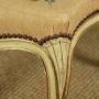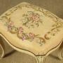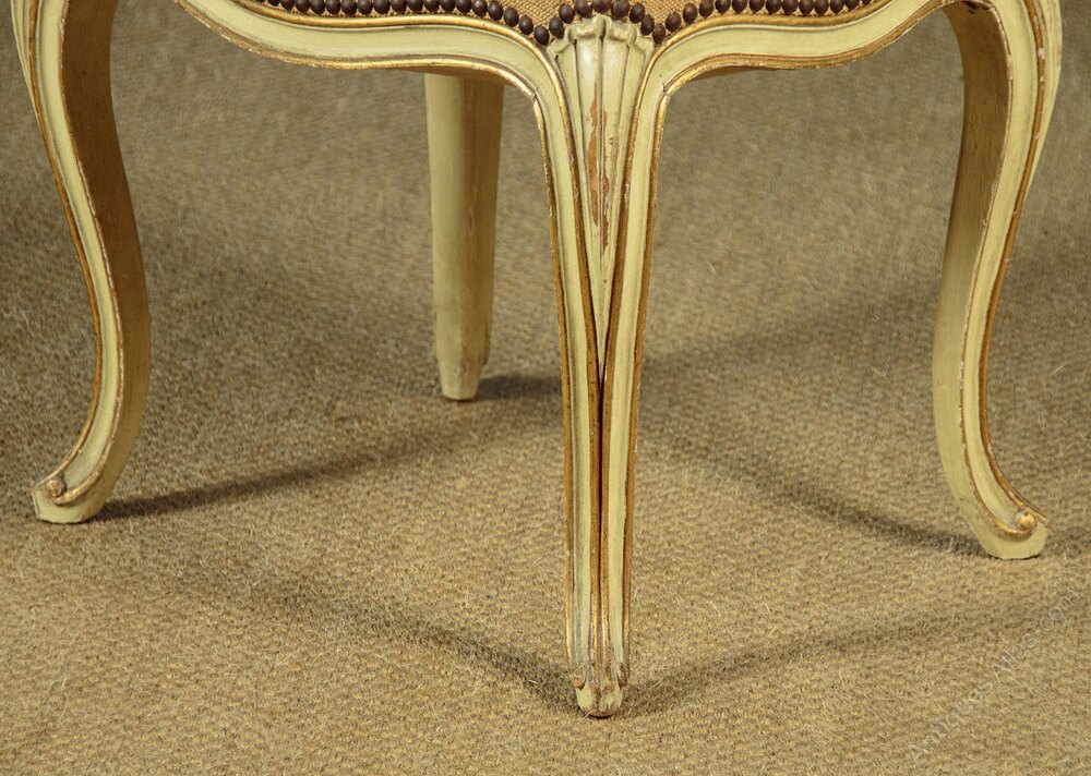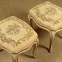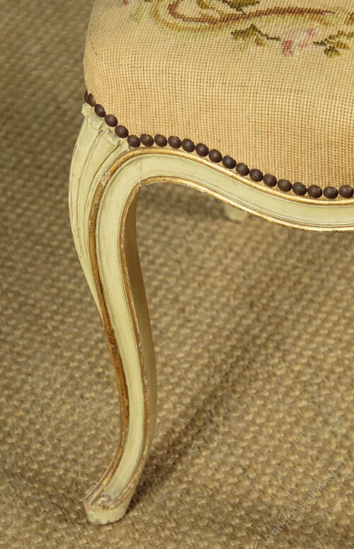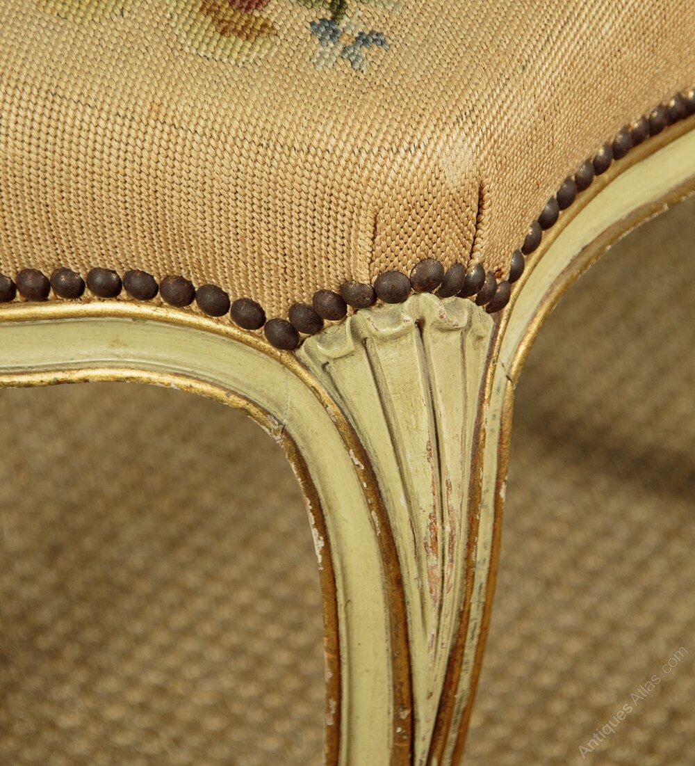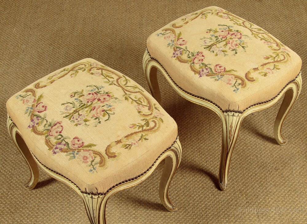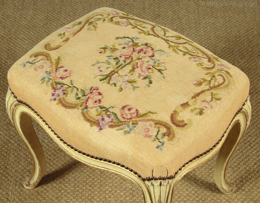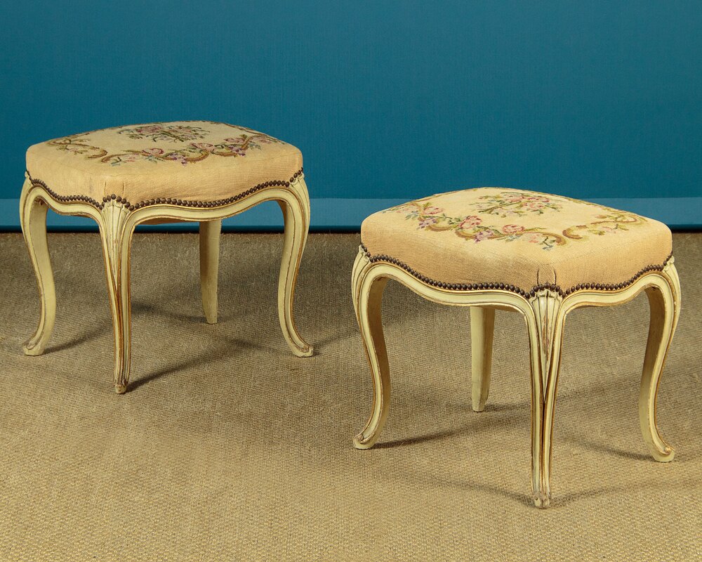 Pretty pair of Louis XV style stools c.1930. Sprung seats upholstered in needle point tapestry covers with floral decoration. Shapely carved and moulded walnut frames with original cream and gold paintwork. Presented as found, solid and sturdy but with wear to the paintwork and covers.