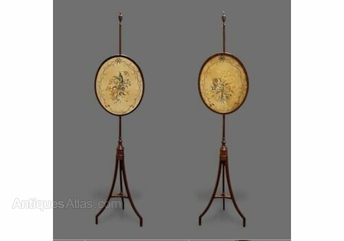 A great Pair of Antique mahogany Pole or fire screens each with oval embroidered silk panels which can be adjusted in height with a brass thumb screw fittings on turned supports and swept elegant legs.