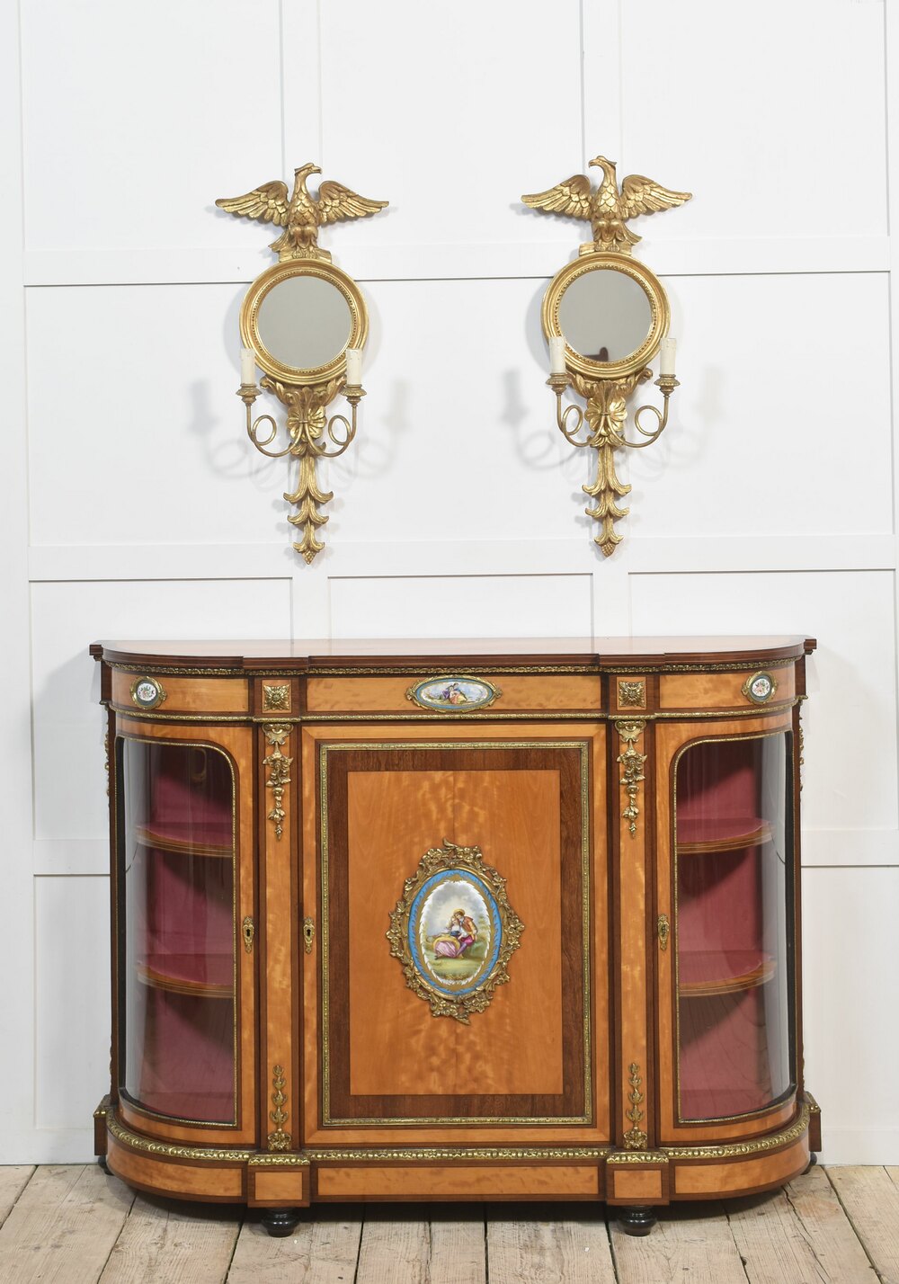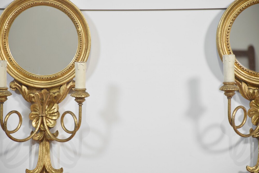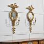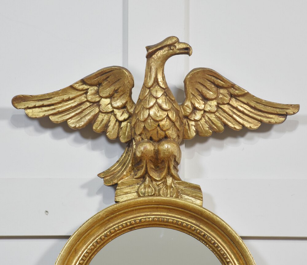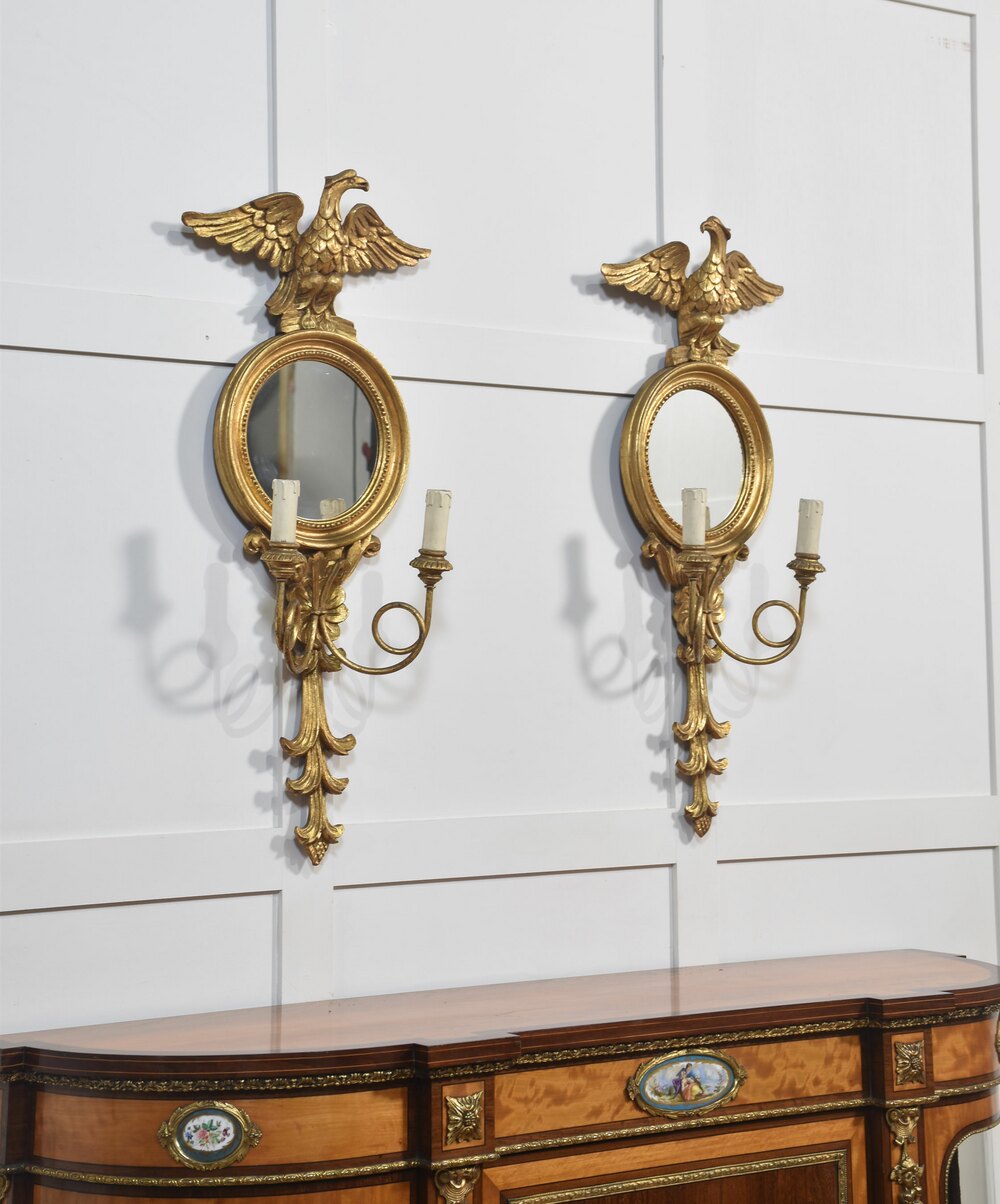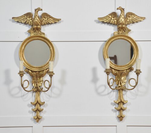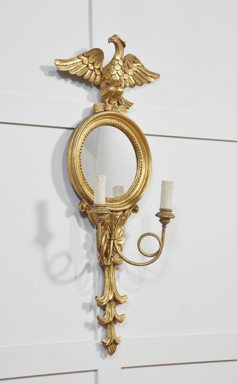 Pair of Regency style wall mirrors, the eagle crest above circular mirror encased in giltwood frame with twin branch light sconces.