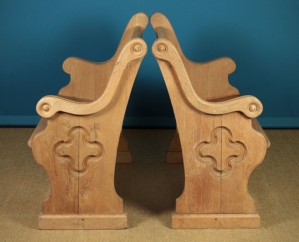 Pair of short oak benches or hall seats c.1900. Just 46″ long, solid oak throughout. Raked backrest and seat between shaped ends with a moulded edge, carved roundels and quatrefoil detail to the outside. Raised on a moulded plinth and joined with turned stretchers which form a useful shelf for shoes. Good condition, very solid and sturdy, left dry and unwaxed.