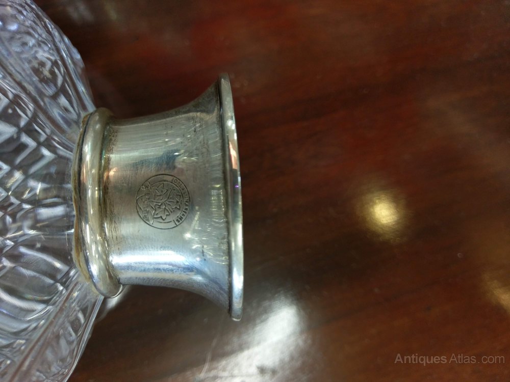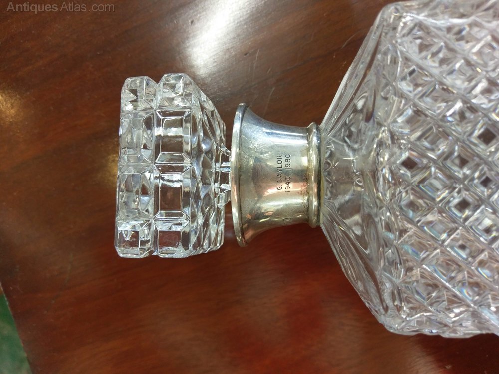 A very good pair of silver mounted whisky decanters. Dating to the late 20th century hallmarked for 1980 and monogrammed. Not antique but in superb condition look unused to me. The glass is moulded hobnail pattern. No damage.