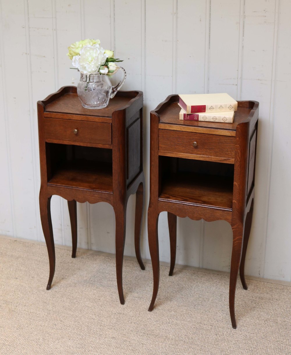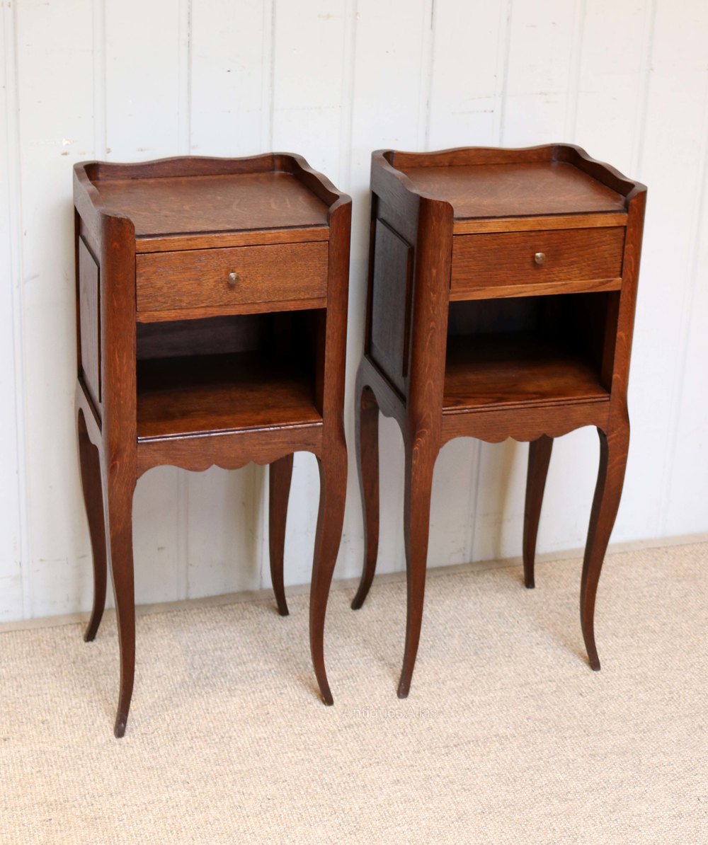 Pair of French small proportioned bedside cabinets having panelled sides with a single drawer above an open cupboard base raised on outsplayed legs