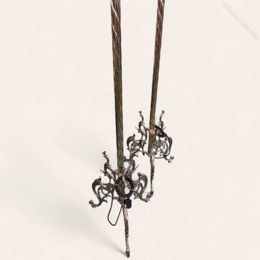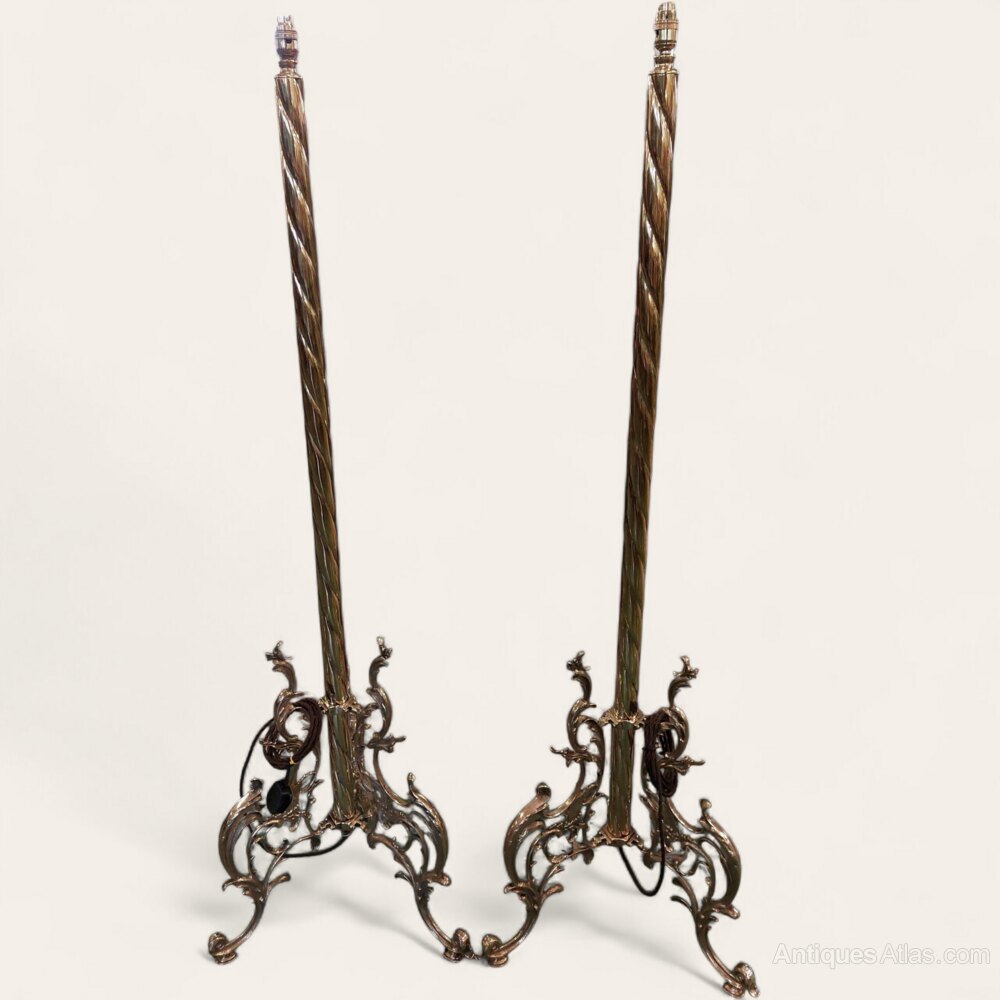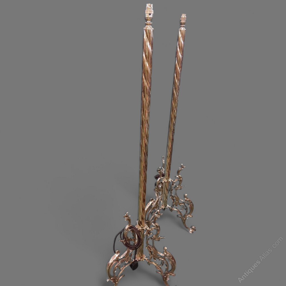 A stunning pair of English fully restored polished solid brass floor lamps. Polished to a very high standard and fully rewired in old style braided flex and tested. Dating to the 1920s and of a very unusual design with spiral columns and organic flowing bases. Top quality and ready to use with your choice of shade. 61" tall with the base 19" wide foot to foot.