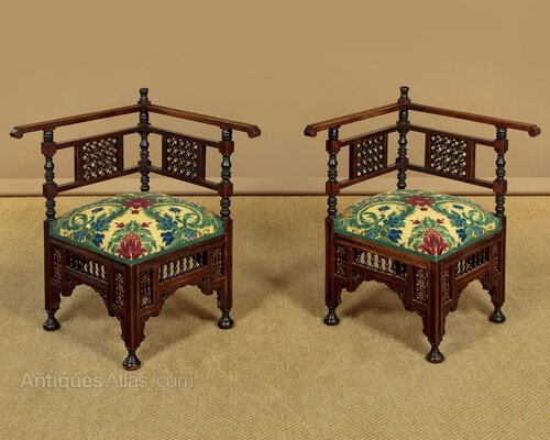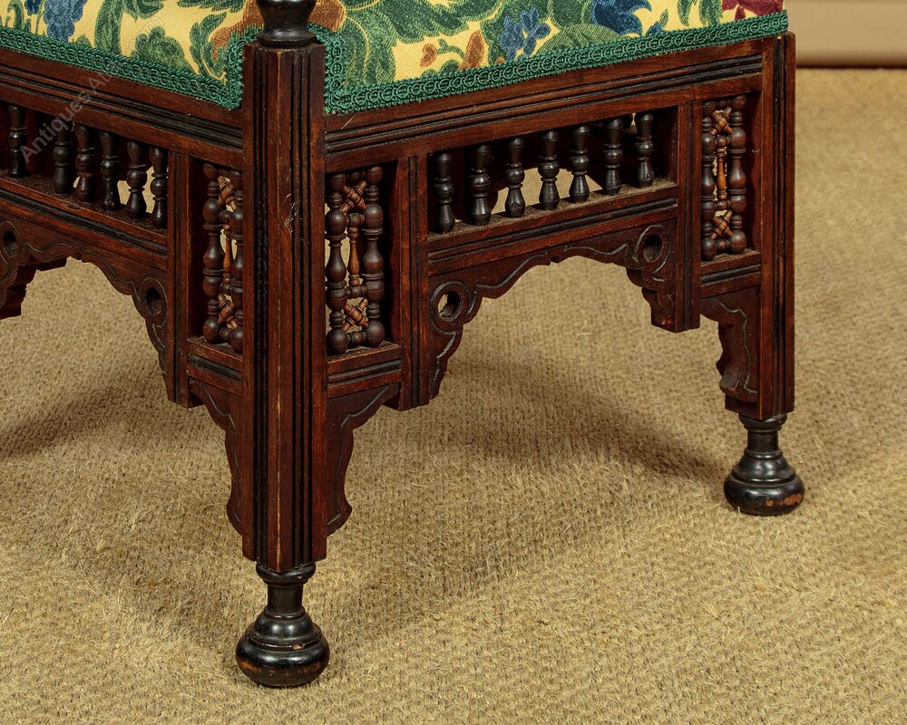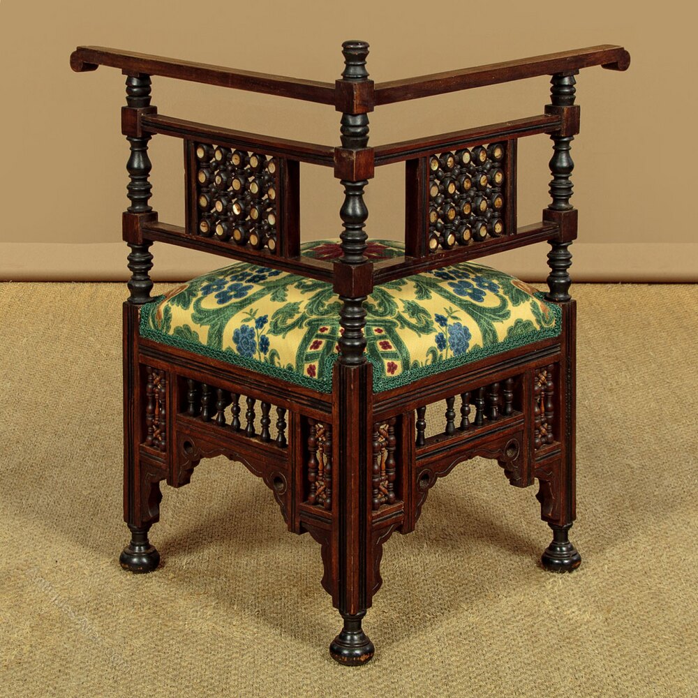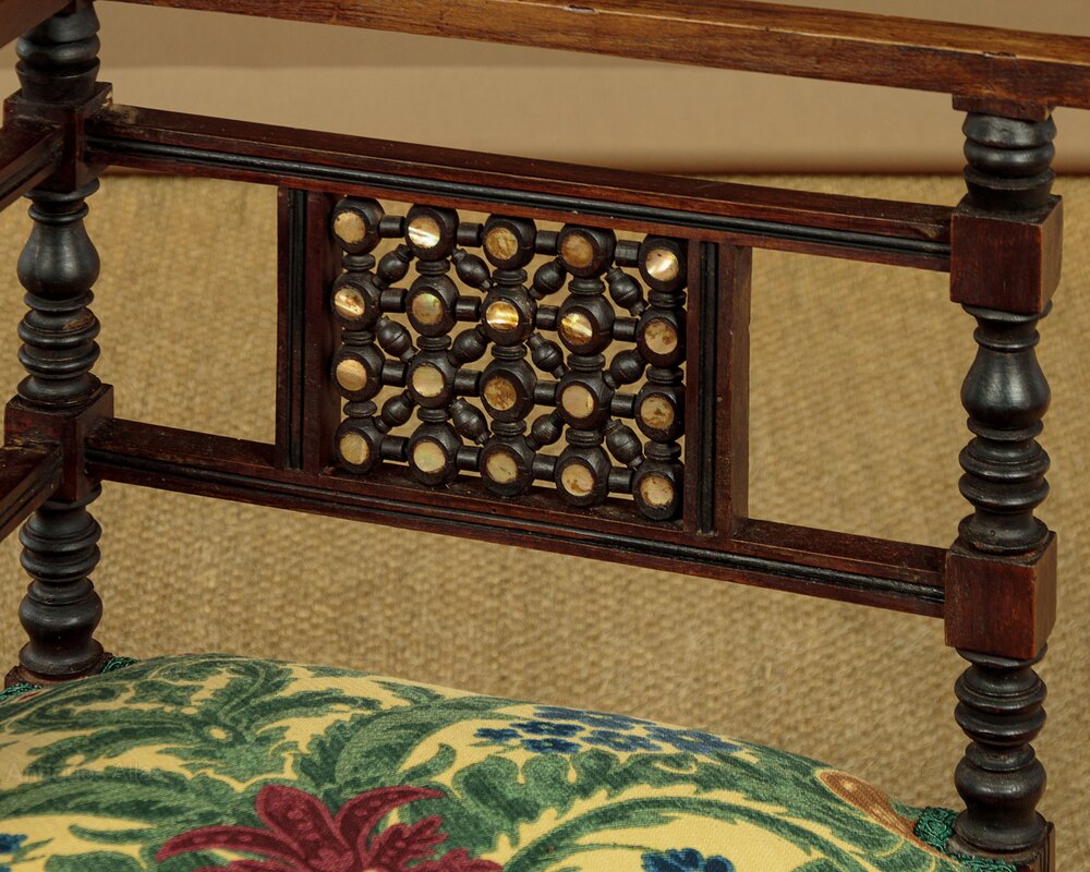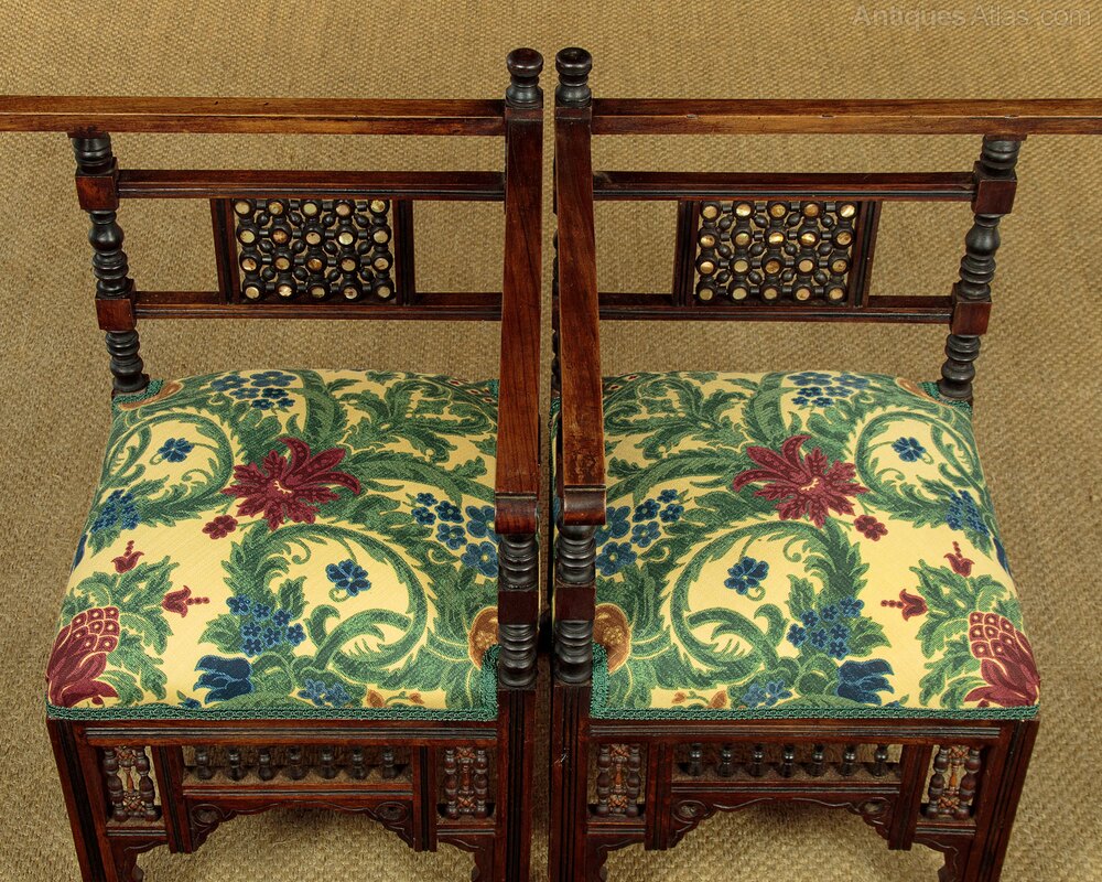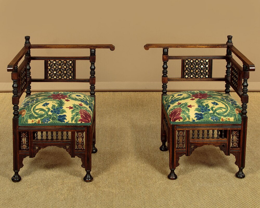 Unusual pair of small Syrian corner armchairs c.1920. Walnut frames with overhanging armrests on turned supports and with mashrabiya panels inlaid with mother of pearl. 17" square sprung seats (height 16") freshly upholstered in a striking damask patterned cloth. Over mashrabiya work panels and shaped and pierced aprons to all four sides. Raised on ebonised turned bun feet. Missing one of the little turned spindles from the rear of one chair. Otherwise very good condition, cleaned and waxed in our workshops.