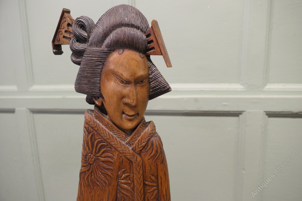 A very Beautiful pair of 1920s Dumb waiters, a Geisha and a Samurai, these 2 Card Butlers are hand carved, they are in 3D so look superb from all sides, the Stands are signed D.R.Vienne, each of the Figures have fine detail carving of patterns on the clothes, hands, and hair, and there are the bodies of dragons carved on the trays