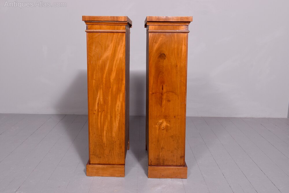 Circa 1860 (with alterations). Pair of Victorian dwarf mahogany open bookcases. The rectangular tops in beautifully figured Spanish mahogany with flat fore-edges and simple friezes above the open bookcases, each with three adjustable shelves, flanked by simple pilasters and sitting on enclosed plinth bases. Lovely colour and patina and in excellent condition.