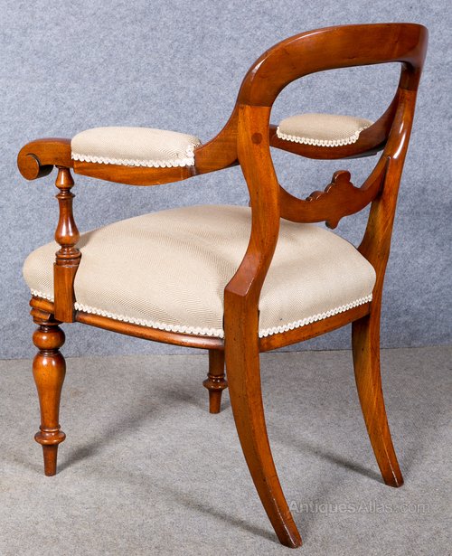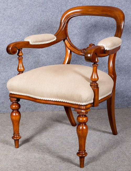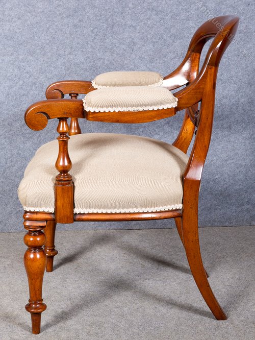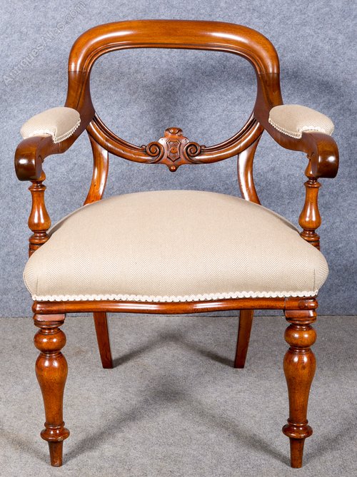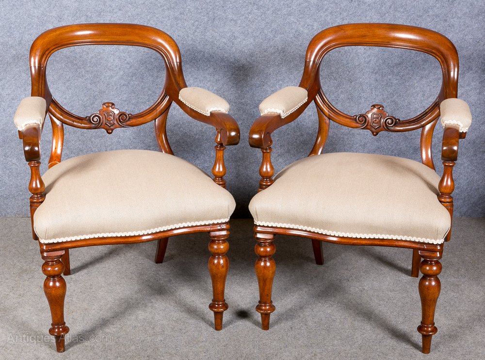 An unusual pair of Victorian mahogany library or elbow chairs. The balloon shaped and thumb moulded backs having a decoratively carved centre rail and open arms with upholstered armrests. The serpentine shaped seats newly upholstered in a good quality herring bone patterned fabric with gimp edging. This pair of chairs are in excellent condition and ready for use. More photos available. Sizes:- Height...35''/ 89cm. Width...23''/ 58.5cm. Max.Depth...26''/ 66cm. Seat Height...20''/51cm. Delivery to most of U.K. mainland £48.