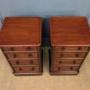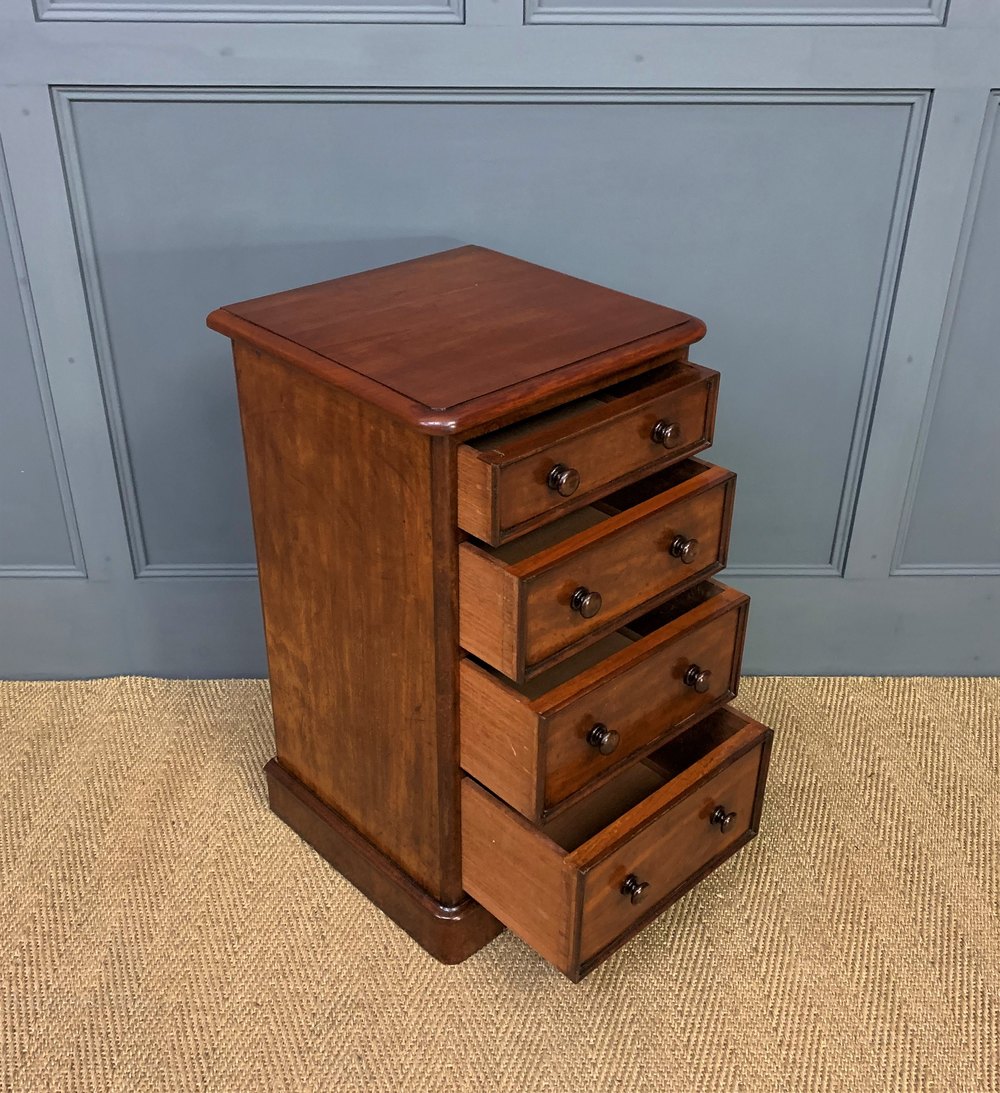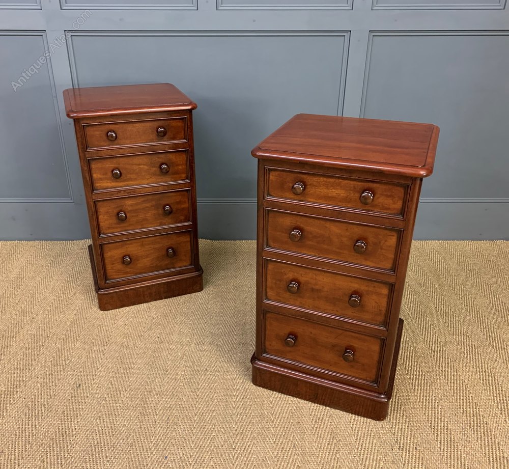 An excellent pair of Victorian period mahogany bedside chests. Each with a series of 4 graduated drawers, each fitted with their original bun handles. Sympathetically refinished in our workshops and now offered for sale in excellent condition. With a great colour and patina , ready to go straight into the home.