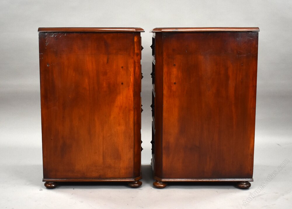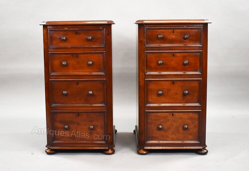 A fine pair of late Victorian mahogany bedside chests of drawers of elegant form and rich colour. Each chest features four graduated drawers fitted with turned wooden knobs and shaped moulded drawer fronts. Standing on turned bun feet, these chests are well-figured and beautifully finished on all sides, making them ideal for either side of a bed or as compact storage pieces in a traditional setting.