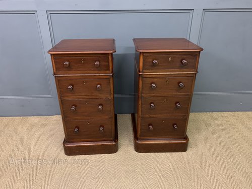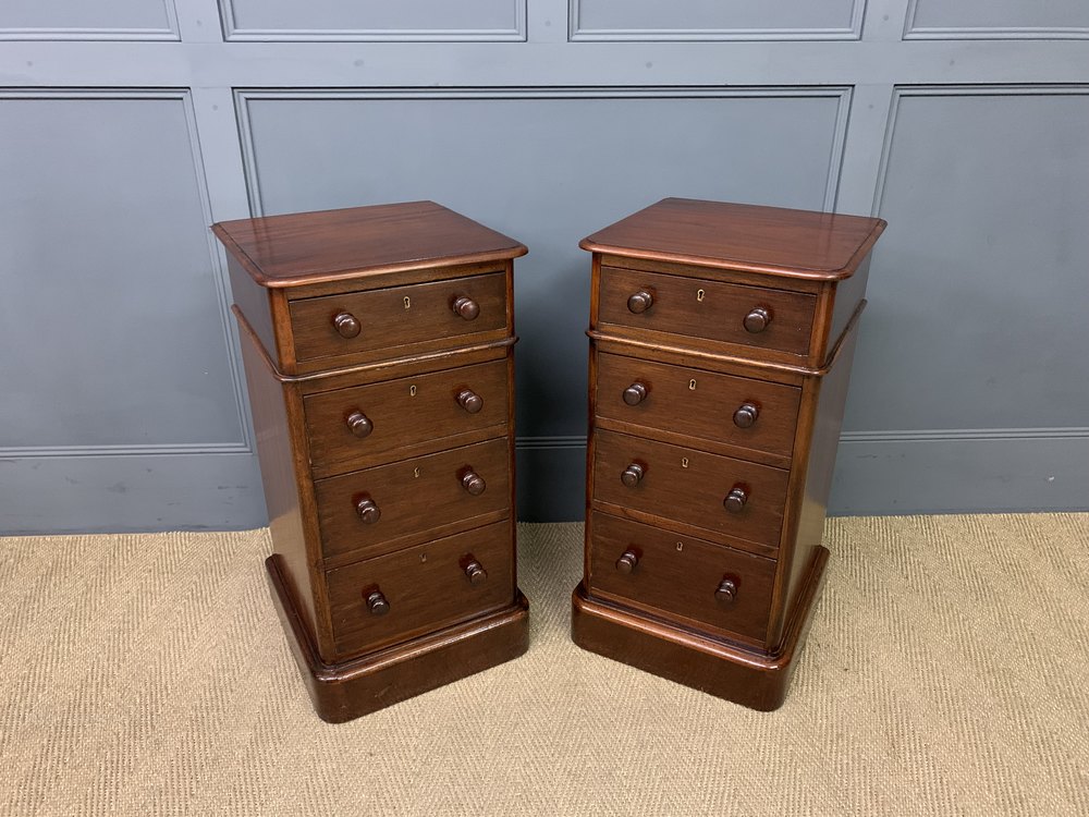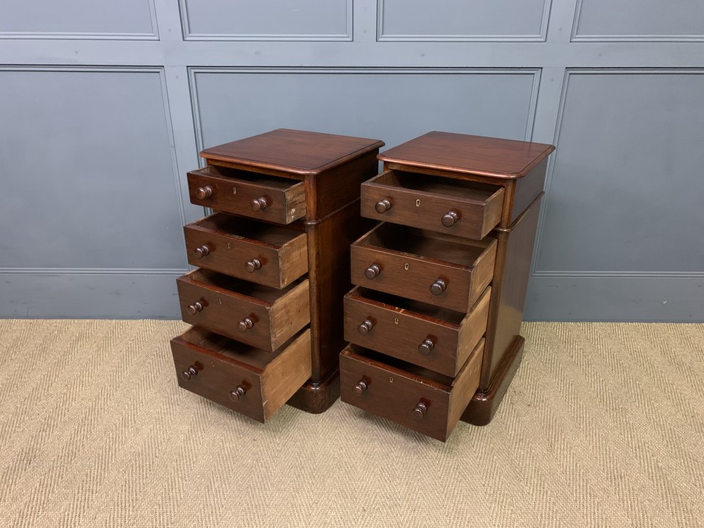 An excellent pair of Victorian period mahogany bedside chests. Each with a series of 4 graduated drawers, each fitted with their original bun handles. Sympathetically refinished in our workshops and now offered for sale in excellent condition. With a great colour and patina , ready to go straight into the home.