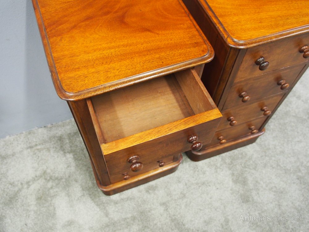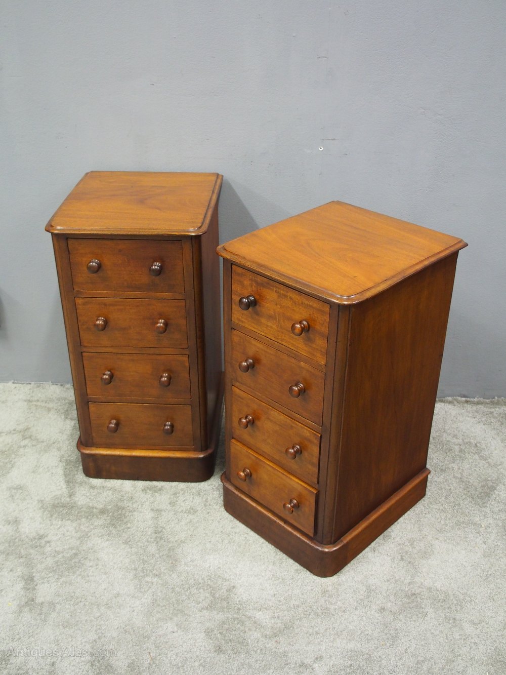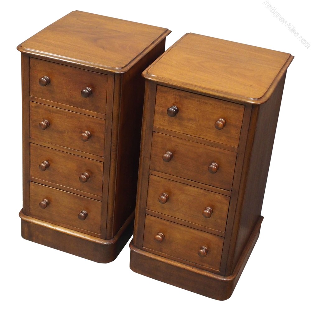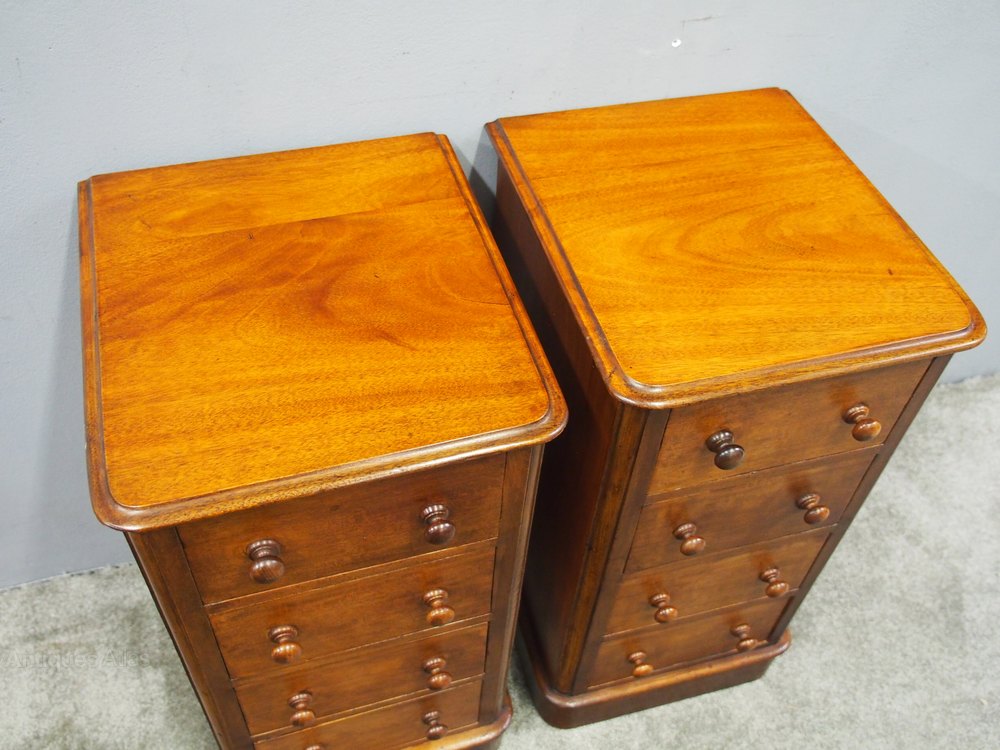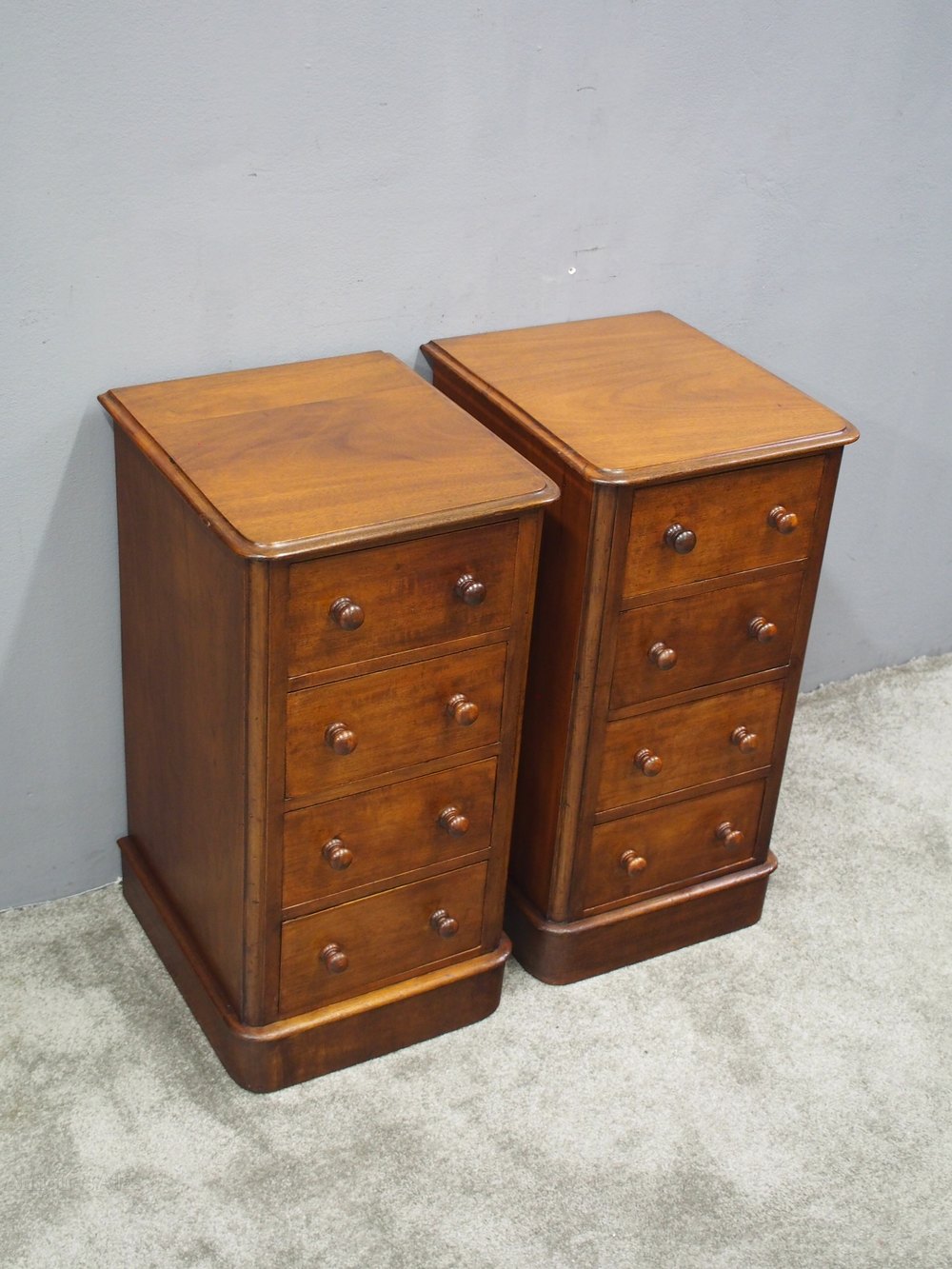 Circa 1860 with adaptations, pair of Victorian mahogany bedsides or small chests of drawers in figured Spanish mahogany. The rectangular tops with moulded edges over 4 drawers with mahogany liners (sign of quality) and twin turned wooded knobs. All standing on enclosed plinth bases.