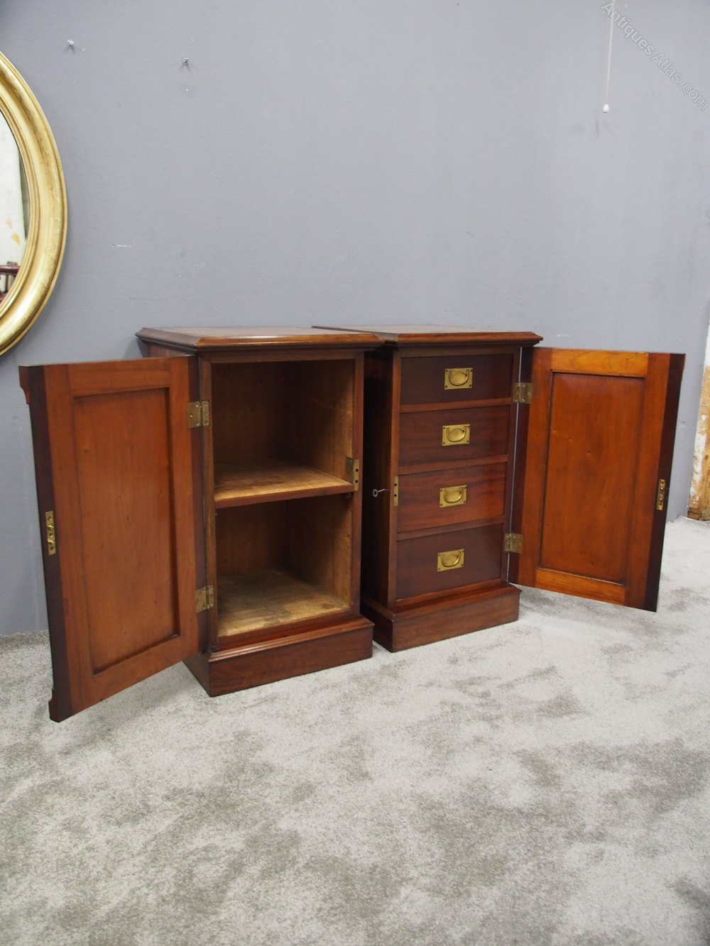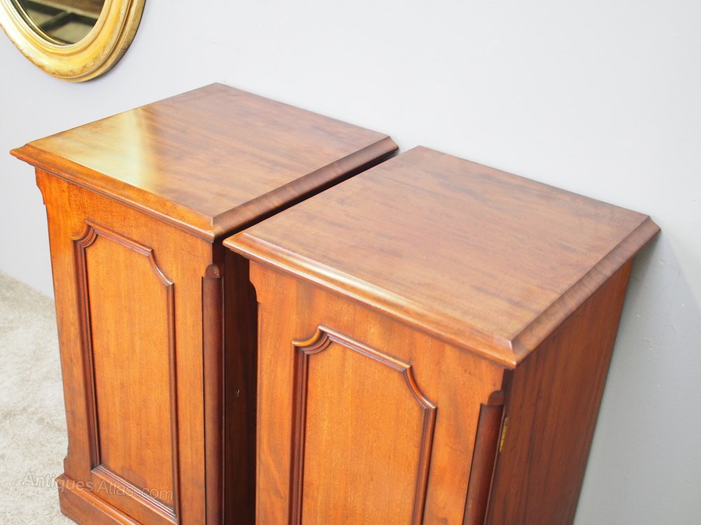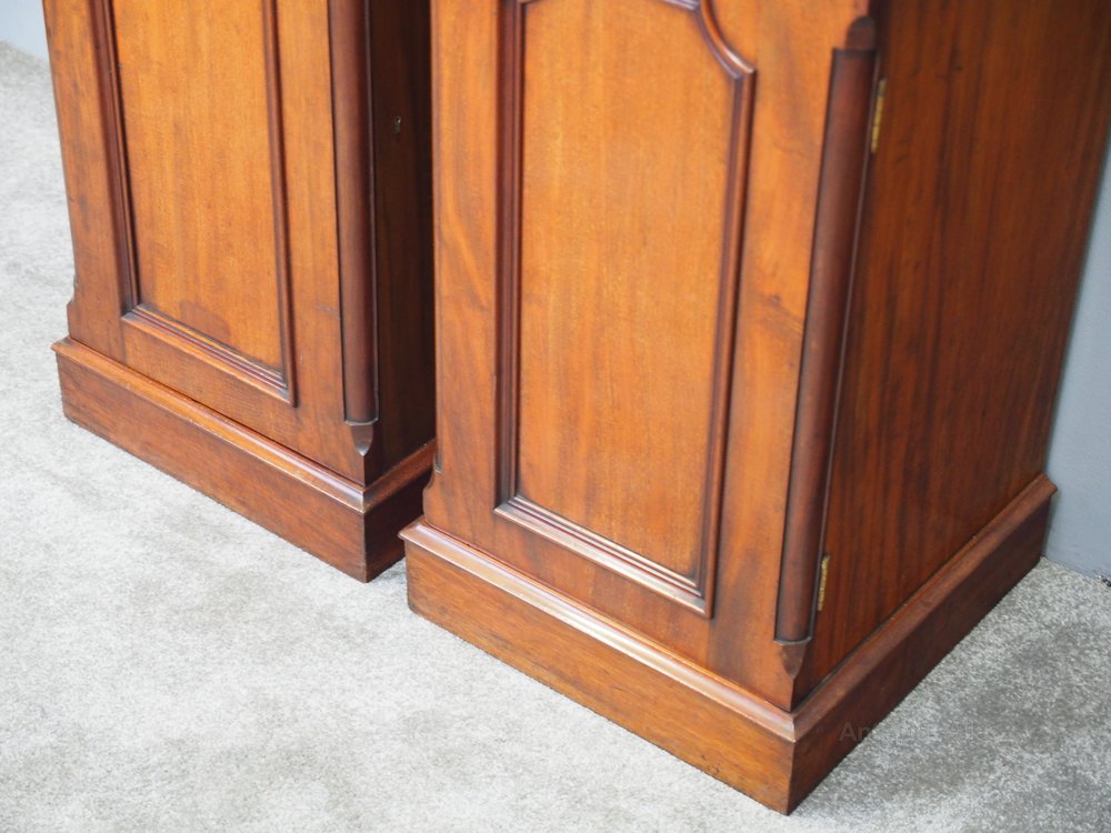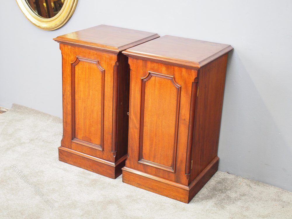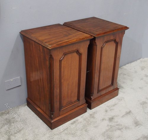 Circa 1860 with adaptations, pair of Victorian mahogany lockers. The rectangular tops in figured Spanish mahogany with thumb-moulded edges are over panelled doors with quarter column sides, and all stand on enclosed plinth bases. One locker has 4 graduated drawers, and the alternative locker has a single shelf.