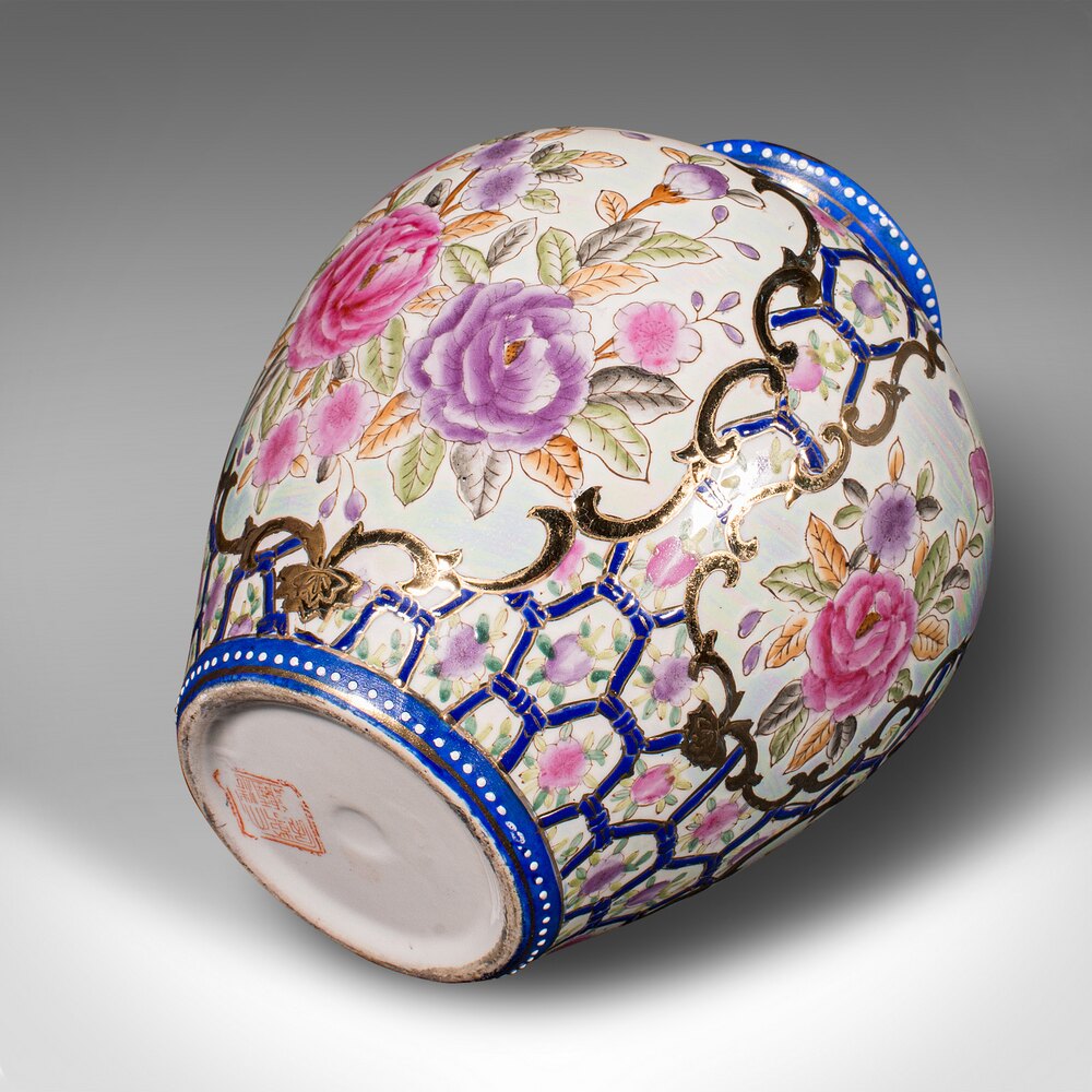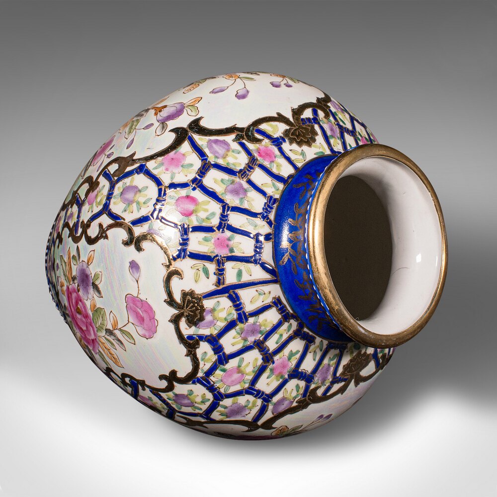 This is an artisan pair of vintage baluster vases. A Chinese, handpainted enamel and lustre decorative urn, dating to the Art Deco period, circa 1940.