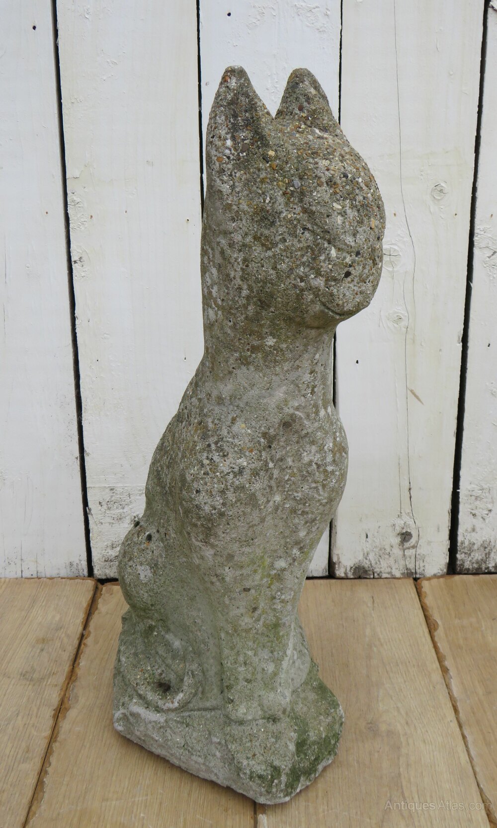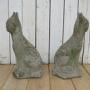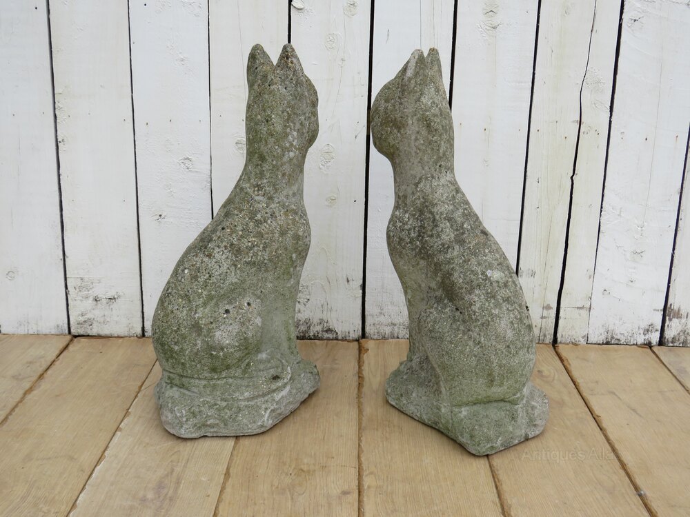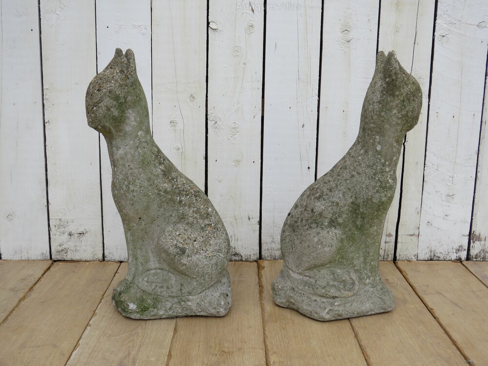 Large pair of vintage English decorative reconstituted stone statuary weathered garden cat ornaments.