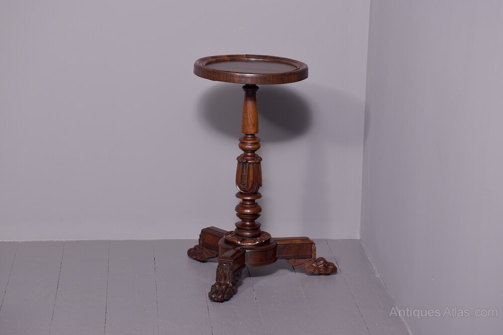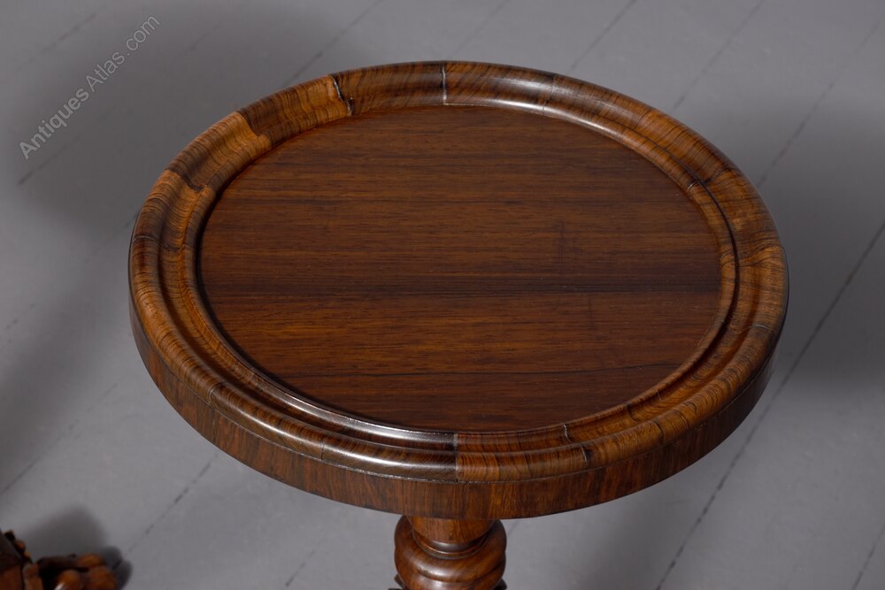 Circa 1830. Rare pair of William 4th rosewood occasional or wine antique tables. The circular tops with crossbanded moulded rims around the figured Brazilian rosewood tops. Supported on foliate-carved and turned tapering stems over tripartite bases with foliate collars and supported on claw feet.